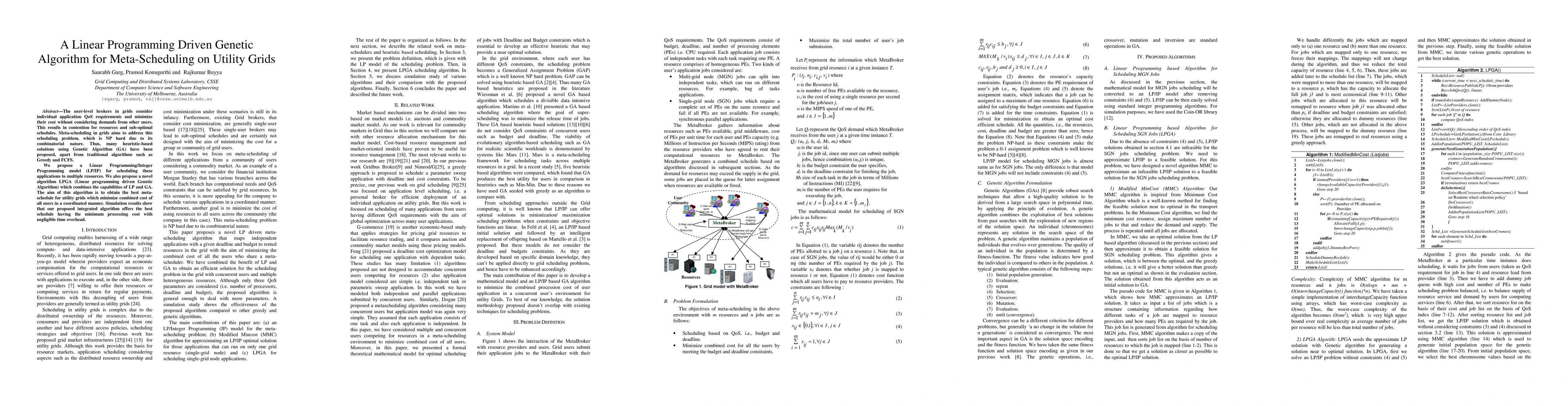 This paper proposes a Linear Programming/Integer Programming model combined with a Genetic Algorithm (LPGA) to optimize meta-scheduling on utility grids, aiming to minimize the combined cost of all users. Simulation results demonstrate that LPGA achieves the best schedule with minimal processing cost and negligible time overhead.