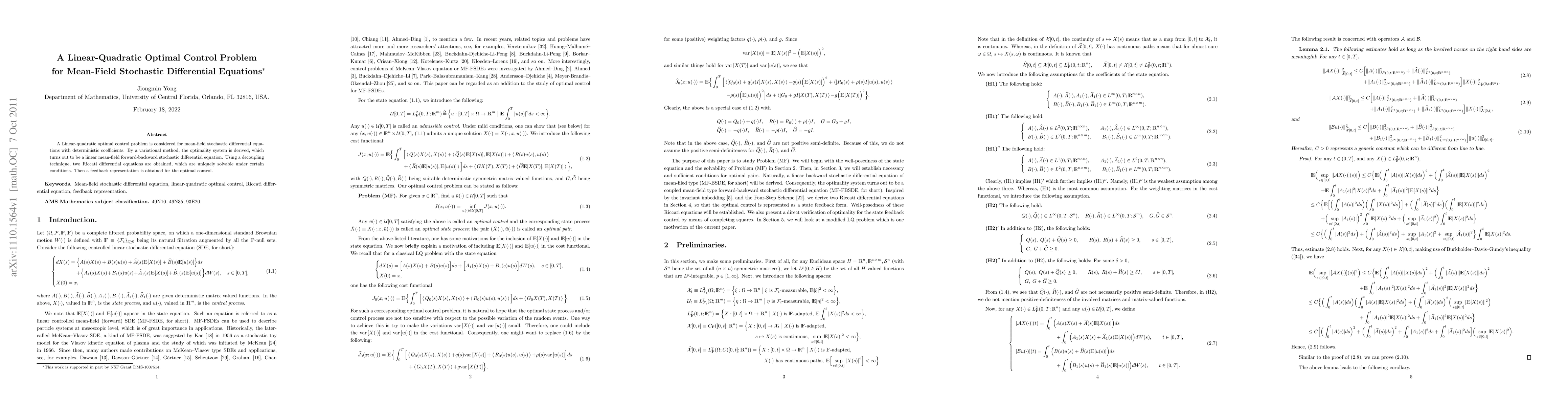 A Linear-quadratic optimal control problem is considered for mean-field stochastic differential equations with deterministic coefficients. By a variational method, the optimality system is derived, which turns out to be a linear mean-field forward-backward stochastic differential equation. Using a decoupling technique, two Riccati differential equations are obtained, which are uniquely solvable under certain conditions. Then a feedback representation is obtained for the optimal control.