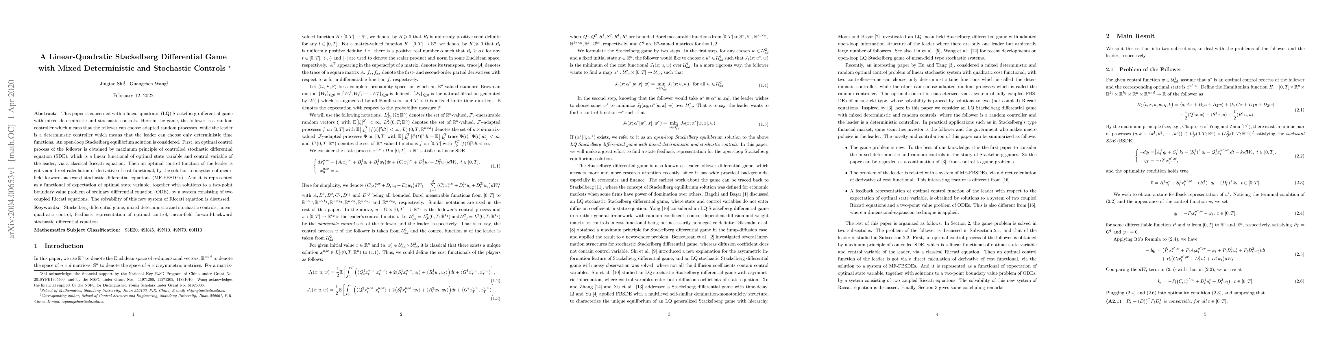 This paper is concerned with a linear-quadratic (LQ) Stackelberg differential game with mixed deterministic and stochastic controls. Here in the game, the follower is a random controller which means that the follower can choose adapted random processes, while the leader is a deterministic controller which means that the leader can choose only deterministic time functions. An open-loop Stackelberg equilibrium solution is considered. First, an optimal control process of the follower is obtained by maximum principle of controlled stochastic differential equation (SDE), which is a linear functional of optimal state variable and control variable of the leader, via a classical Riccati equation. Then an optimal control function of the leader is got via a direct calculation of derivative of cost functional, by the solution to a system of mean-field forward-backward stochastic differential equations (MF-FBSDEs). And it is represented as a functional of expectation of optimal state variable, together with solutions to a two-point boundary value problem of ordinary differential equation (ODE), by a system consisting of two coupled Riccati equations. The solvability of this new system of Riccati equation is discussed.