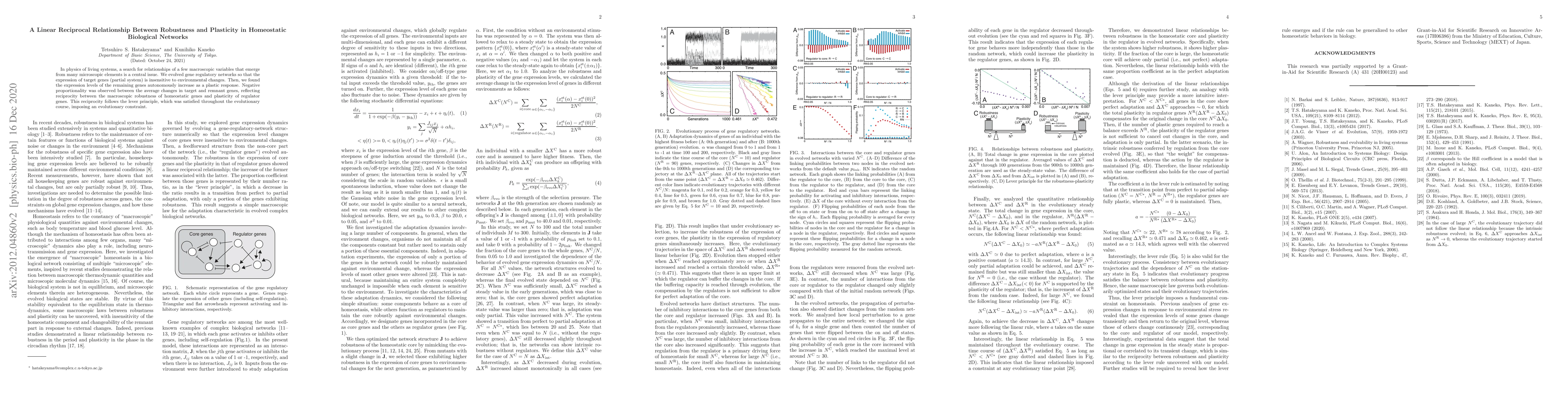 In physics of living systems, a search for relationships of a few macroscopic variables that emerge from many microscopic elements is a central issue. We evolved gene regulatory networks so that the expression of target genes (partial system) is insensitive to environmental changes. Then, we found the expression levels of the remaining genes autonomously increase as a plastic response. Negative proportionality was observed between the average changes in target and remnant genes, reflecting reciprocity between the macroscopic robustness of homeostatic genes and plasticity of regulator genes. This reciprocity follows the lever principle, which was satisfied throughout the evolutionary course, imposing an evolutionary constraint.