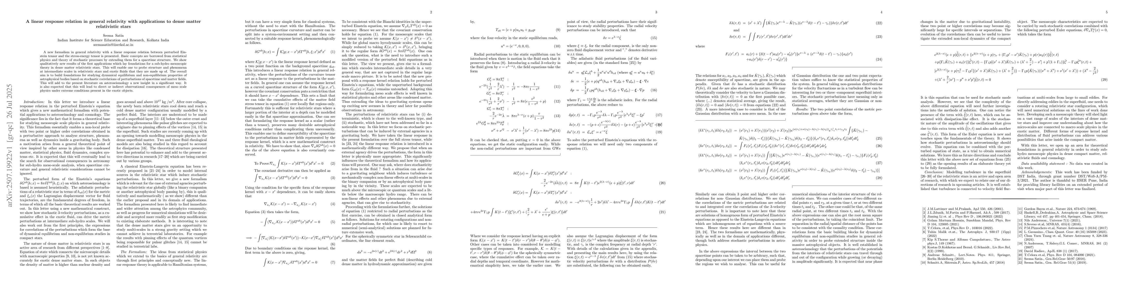 A new formalism in general relativity with a linear response relation between perturbed Einstein tensor and the stress-energy tensor is presented. Basic concepts are borrowed from statistical physics and theory of stochastic processes by extending them for a spacetime structure. We show qualitatively new results of the first applications which lay foundations for a sub-hydro mesoscopic theory in dense matter relativistic stars. This will enable one to probe structure and phenomena at intermediate scales in relativistic stars and exotic fluids that they are made up of. The overall aim is to build foundations for studying dynamical equilibrium and non-equilibrium properties of astrophysical bodies based on stochastic correlations of perturbations of spacetime and matter fields. This will add to the present literature on asteroseismology a new insight in a significant way.It is also expected that this will lead to direct or indirect observational consequences of meso scale physics under extreme conditions present in the exotic objects.