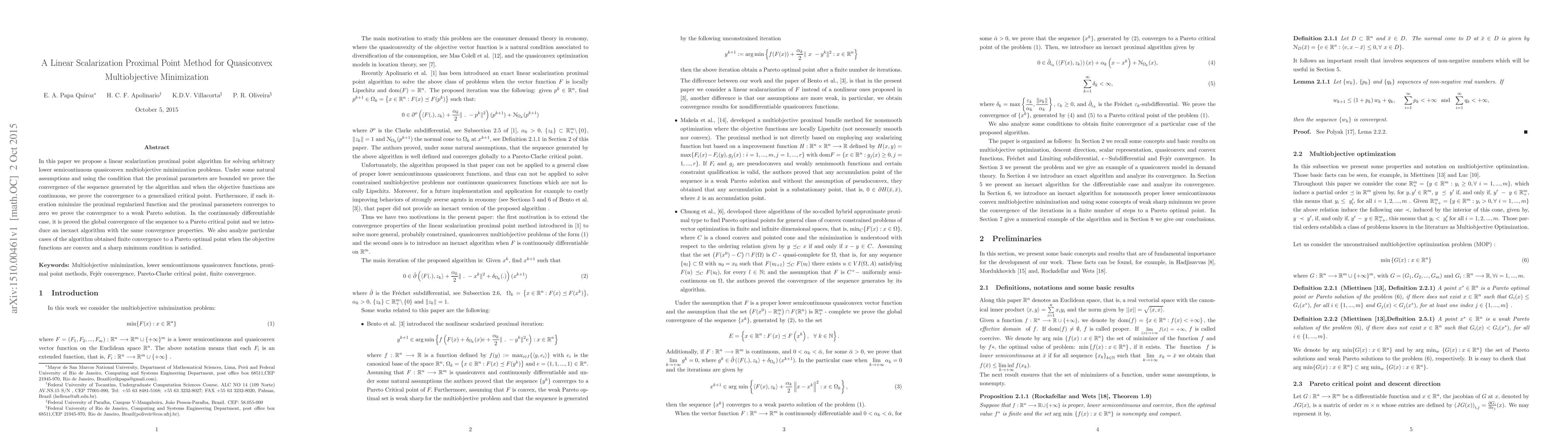 This paper introduces a linear scalarization proximal point method for solving quasiconvex multiobjective minimization problems, proving convergence under bounded proximal parameters and conditions for convergence to generalized critical points or weak Pareto solutions. It also discusses global convergence in the continuously differentiable case and finite convergence for convex objective functions.