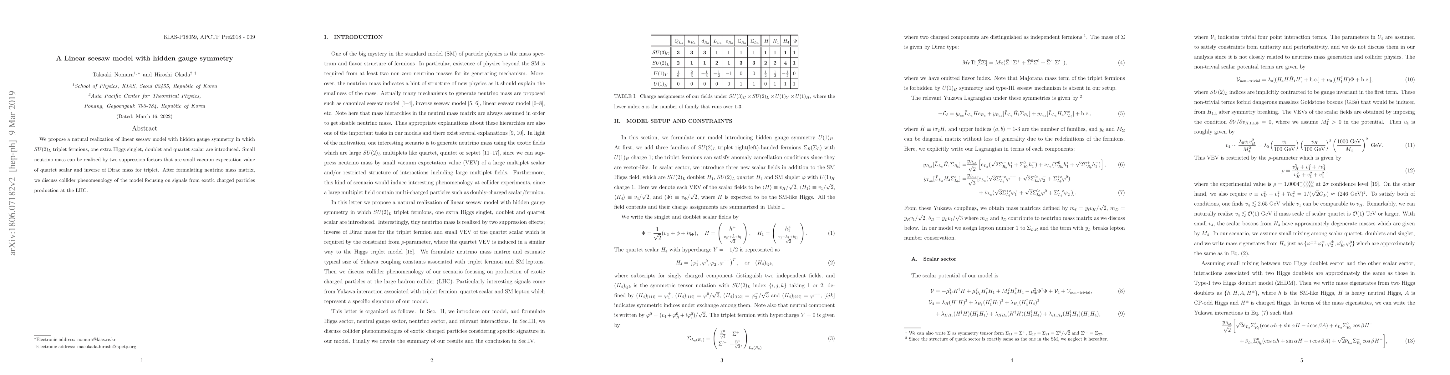 This paper proposes a linear seesaw model with hidden gauge symmetry using $SU(2)_L$ triplet fermions and additional scalars to generate small neutrino masses. It also explores collider phenomenology, particularly the production of exotic charged particles at the LHC.