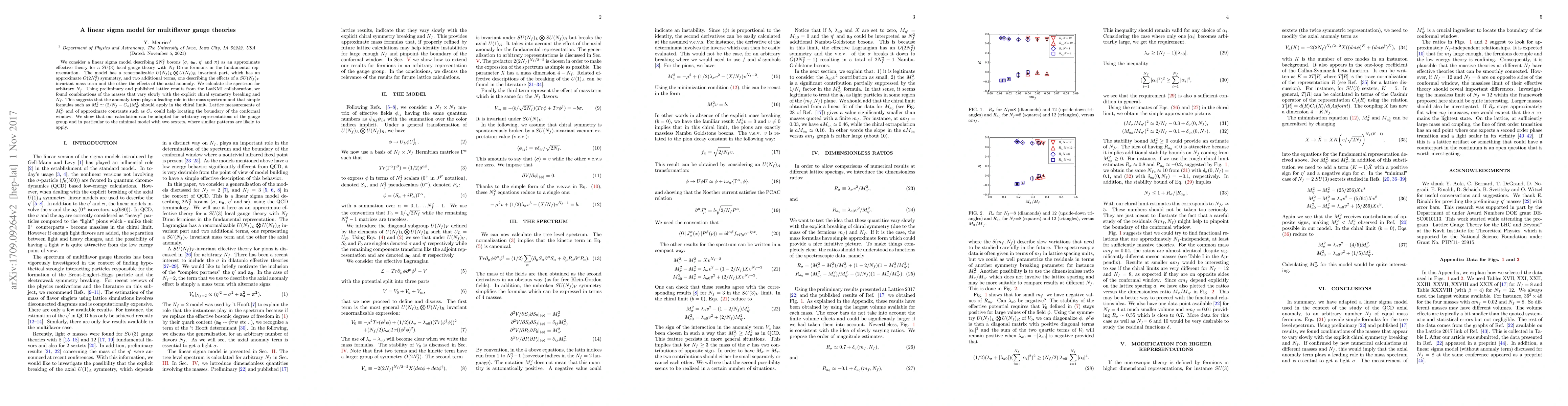 We consider a linear sigma model describing $2N_f^2$ bosons ($\sigma$, ${\bf a_0}$, $\eta '$ and ${\bf \pi}$) as an approximate effective theory for a $SU(3)$ local gauge theory with $N_f$ Dirac fermions in the fundamental representation. The model has a renormalizable $U(N_f)_L\bigotimes U(N_f)_R$ invariant part, which has an approximate $O(2N_f^2)$ symmetry, and two additional terms, one describing the effects of a $SU(N_f)_V$ invariant mass term and the other the effects of the axial anomaly. We calculate the spectrum for arbitrary $N_f$. Using preliminary and published lattice results from the LatKMI collaboration, we found combinations of the masses that vary slowly with the explicit chiral symmetry breaking and $N_f$. This suggests that the anomaly term plays a leading role in the mass spectrum and that simple formulas such as $M_\sigma^2\simeq (2/N_f-C_\sigma)M_{\eta '}^2$ should apply in the chiral limit. Lattice measurements of $M_{\eta '}^2$ and of approximate constants such as $C_\sigma$ could help locating the boundary of the conformal window. We show that our calculation can be adapted for arbitrary representations of the gauge group and in particular to the minimal model with two sextets, where similar patterns are likely to apply.
