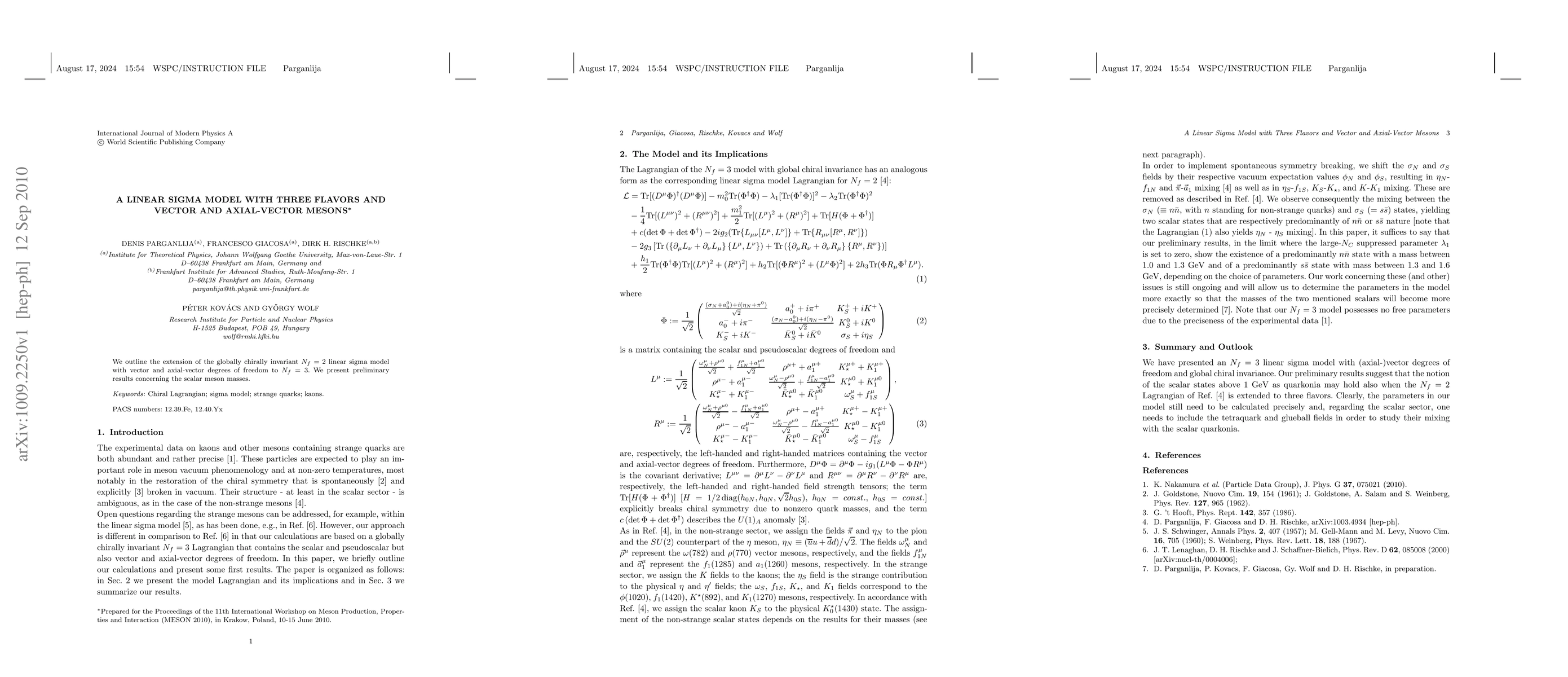 Summary: This paper extends the chirally invariant Nf=2 linear sigma model to Nf=3 flavors, incorporating vector and axial-vector mesons, and provides initial findings on the resulting scalar meson masses.
