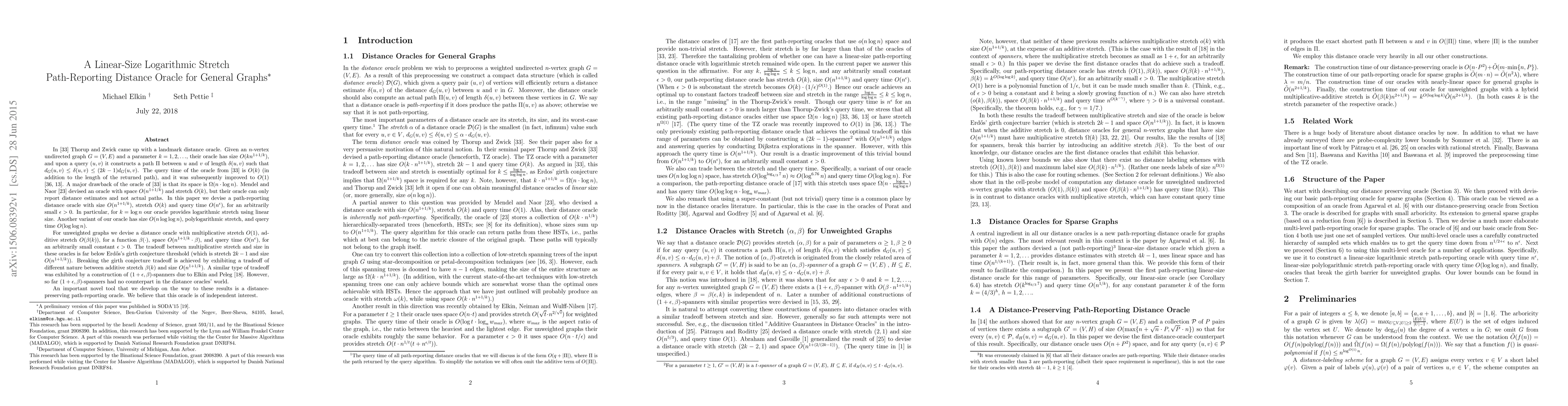 This paper introduces a novel distance oracle for general graphs that achieves linear size and logarithmic stretch, improving upon previous oracles by Thorup and Zwick. The oracle provides path-reporting capabilities with query time of $O(n^\epsilon)$ for arbitrarily small $\epsilon > 0$, and offers variants with polylogarithmic stretch and improved tradeoffs between multiplicative and additive stretch.