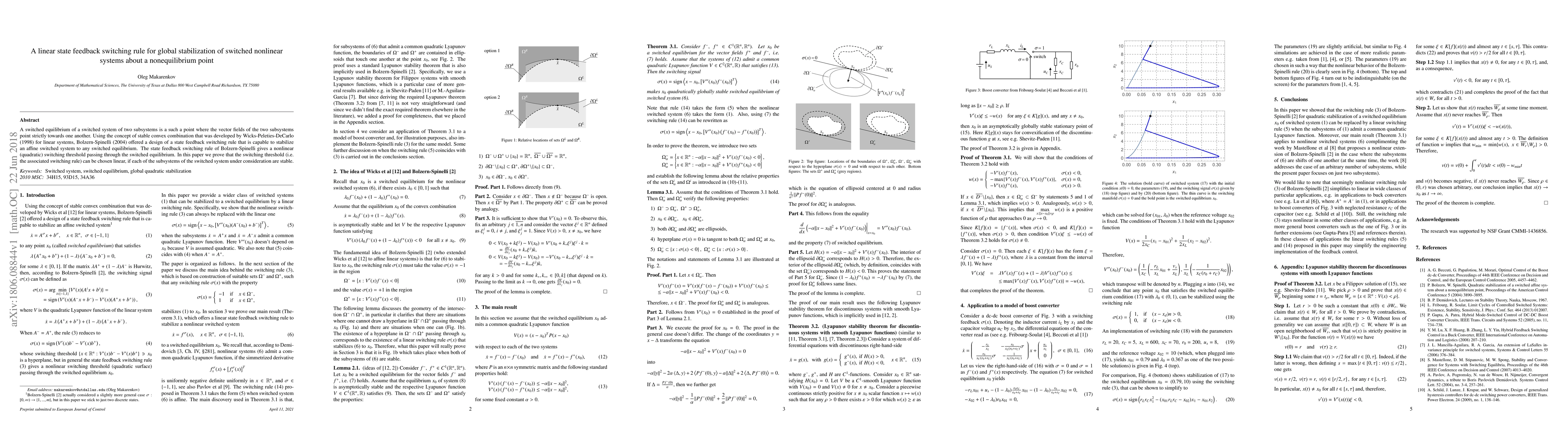 This paper proposes a linear state feedback switching rule for global stabilization of switched nonlinear systems around a nonequilibrium point, extending the stable convex combination concept to nonlinear systems. It demonstrates that the switching threshold can be linear if each subsystem is stable, improving upon previous nonlinear switching thresholds.