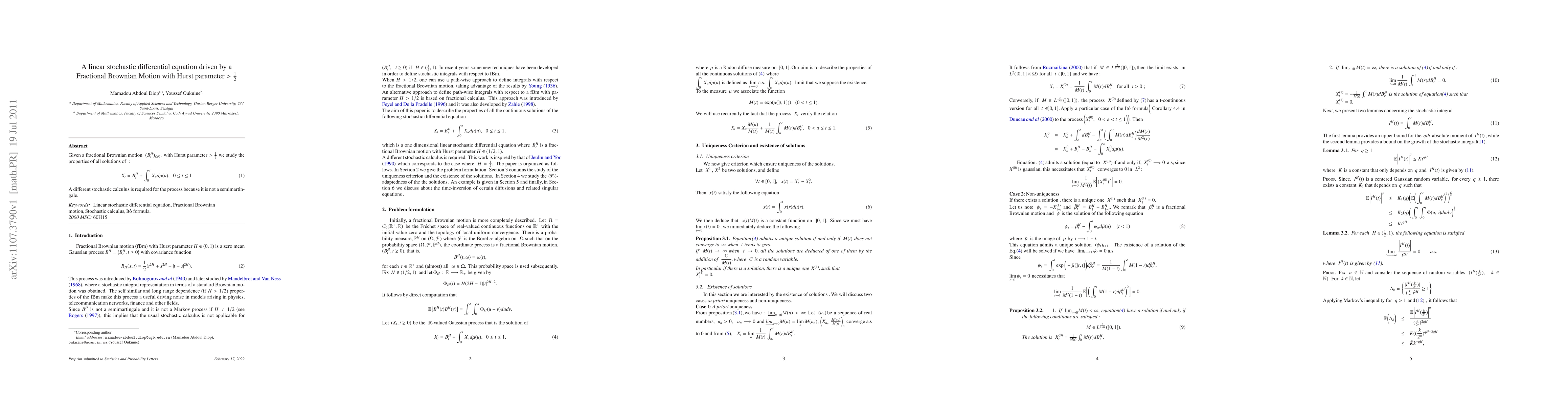 Summary: This paper investigates the properties of solutions to a linear stochastic differential equation driven by fractional Brownian motion with Hurst parameter greater than 1/2, noting that a distinct stochastic calculus is necessary due to the non-semimartingale nature of the process.