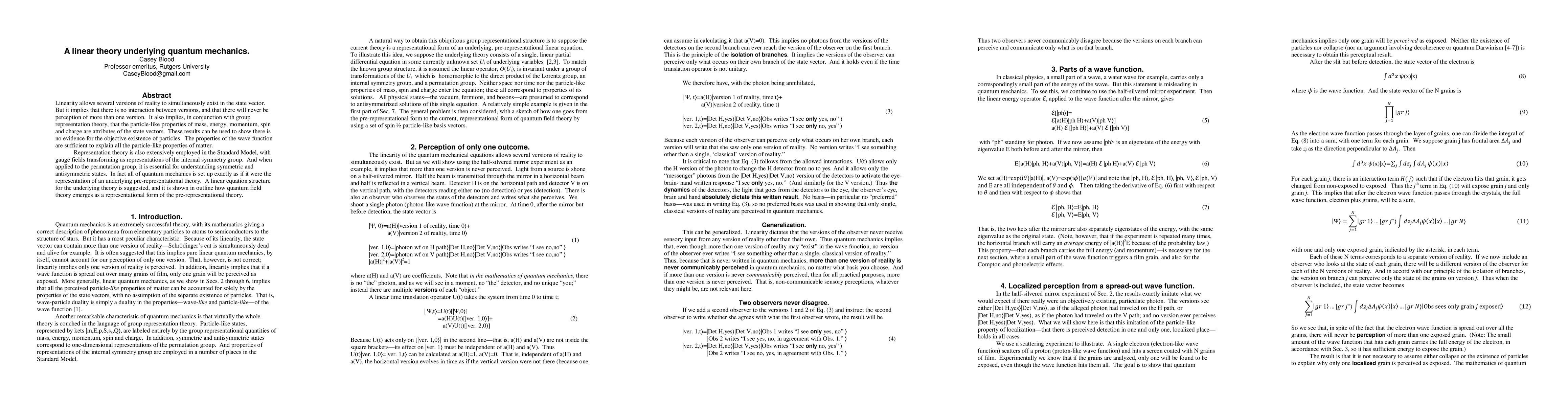 Linearity allows several versions of reality to simultaneously exist in the state vector. But it implies that there is no interaction between versions, and that there will never be perception of more than one version. It also implies, in conjunction with group representation theory, that the particle-like properties of mass, energy, momentum, spin and charge are attributes of the state vectors. These results can be used to show there is no evidence for the objective existence of particles. The properties of the wave function are sufficient to explain all the particle-like properties of matter. Representation theory is also extensively employed in the Standard Model, with gauge fields transforming as representations of the internal symmetry group. And when applied to the permutation group, it is essential for understanding symmetric and antisymmetric states. In fact all of quantum mechanics is set up exactly as if it were the representation of an underlying pre-representational theory. A linear equation structure for the underlying theory is suggested, and it is shown in outline how quantum field theory emerges as a representational form of the pre-representational theory.