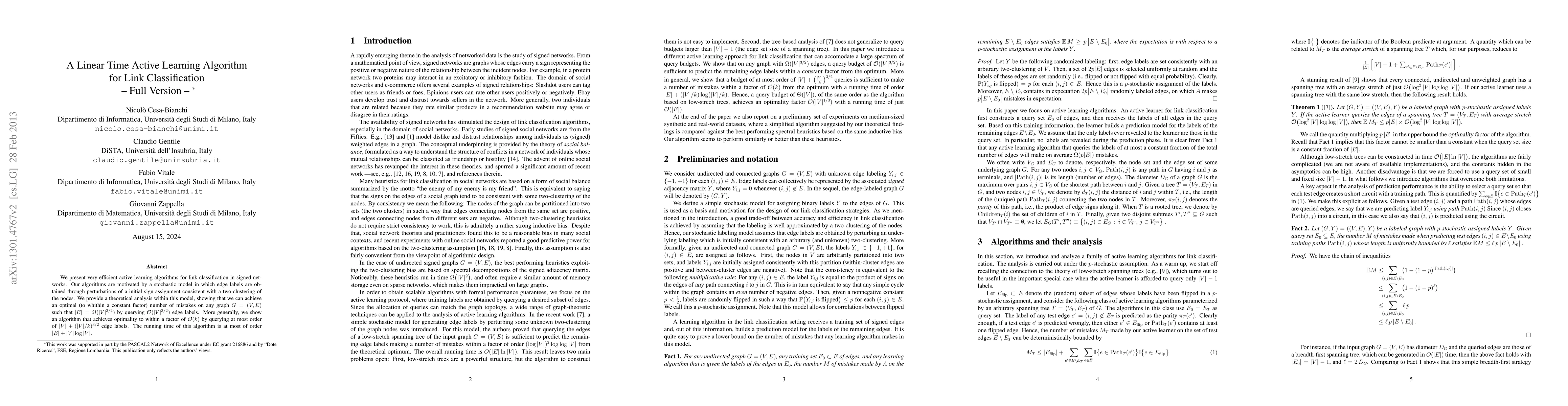 This paper introduces an efficient active learning algorithm for link classification in signed networks, achieving near-optimal performance by querying a minimal number of edge labels. The algorithm operates in linear time and is theoretically proven to minimize classification errors effectively.