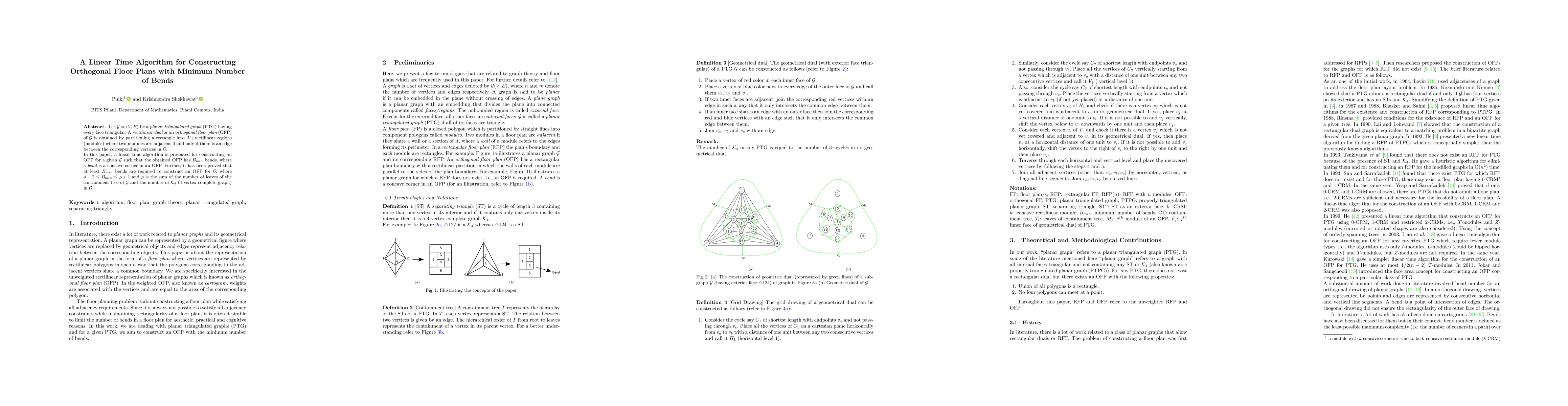 Let G = (V, E) be a planar triangulated graph (PTG) having every face triangular. A rectilinear dual or an orthogonal floor plan (OFP) of G is obtained by partitioning a rectangle into \mid V \mid rectilinear regions (modules) where two modules are adjacent if and only if there is an edge between the corresponding vertices in G. In this paper, a linear-time algorithm is presented for constructing an OFP for a given G such that the obtained OFP has B_{min} bends, where a bend in a concave corner in an OFP. Further, it has been proved that at least B_{min} bends are required to construct an OFP for G, where \rho - 2 \leq B_{min} \leq \rho + 1 and \rho is the sum of the number of leaves of the containment tree of G and the number of K_4 (4-vertex complete graph) in G.
