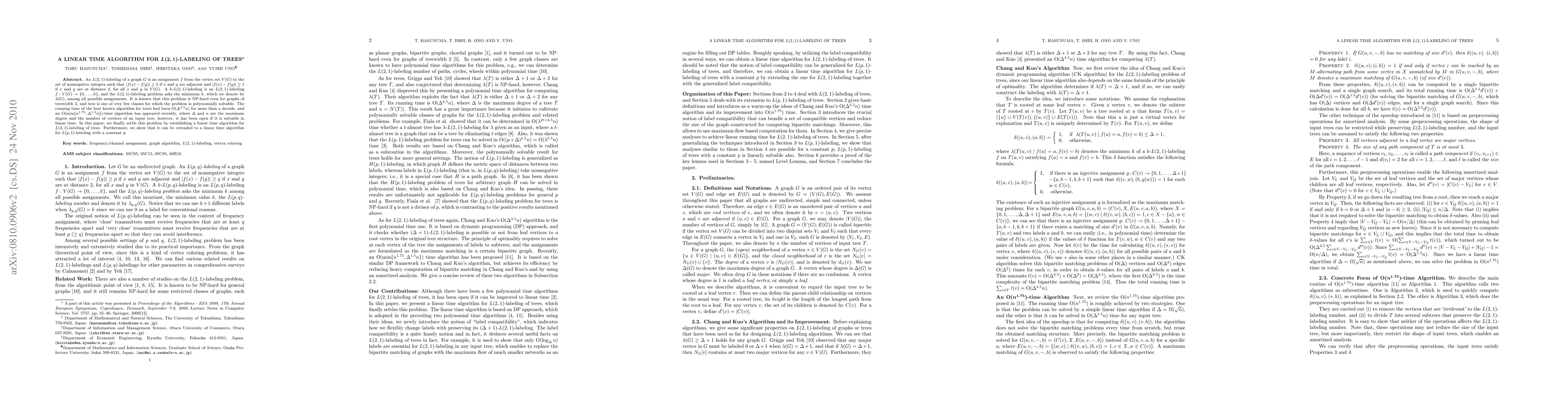 This paper presents a linear time algorithm for solving the L(2,1)-labeling problem on trees, which assigns labels to vertices such that adjacent vertices have a label difference of at least 2 and vertices two edges apart have a difference of at least 1. This significantly improves upon previous algorithms with running times of $\mO(n^{1.75})$.