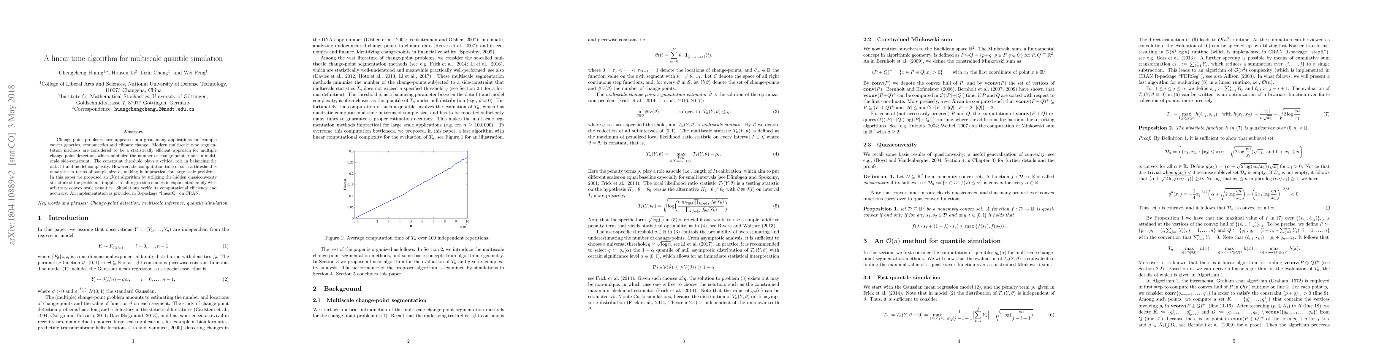 Change-point problems have appeared in a great many applications for example cancer genetics, econometrics and climate change. Modern multiscale type segmentation methods are considered to be a statistically efficient approach for multiple change-point detection, which minimize the number of change-points under a multiscale side-constraint. The constraint threshold plays a critical role in balancing the data-fit and model complexity. However, the computation time of such a threshold is quadratic in terms of sample size $n$, making it impractical for large scale problems. In this paper we proposed an $\mathcal{O}(n)$ algorithm by utilizing the hidden quasiconvexity structure of the problem. It applies to all regression models in exponential family with arbitrary convex scale penalties. Simulations verify its computational efficiency and accuracy. An implementation is provided in R-package "linearQ" on CRAN.