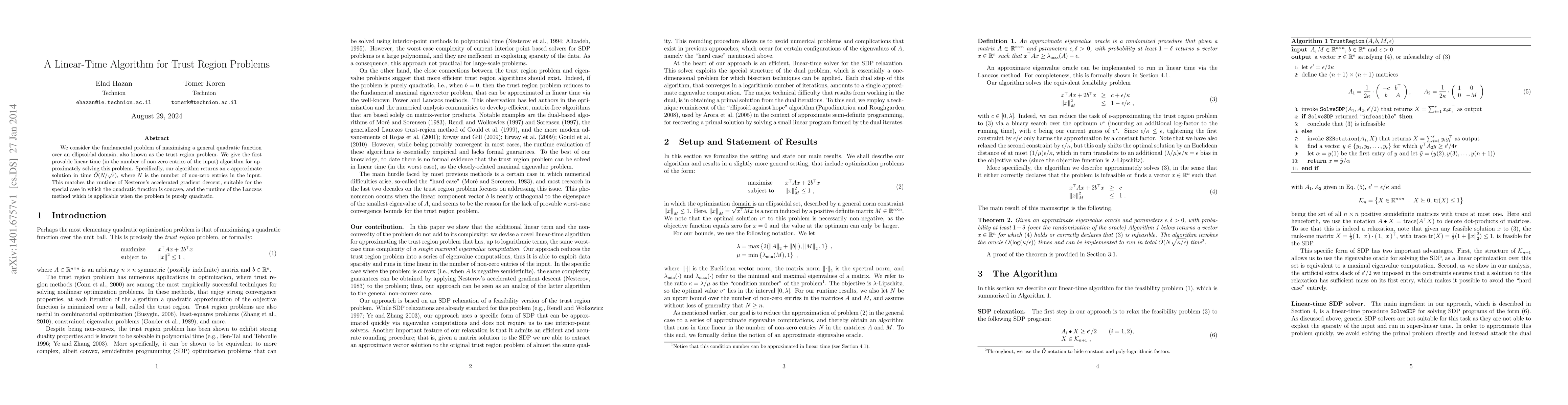 We consider the fundamental problem of maximizing a general quadratic function over an ellipsoidal domain, also known as the trust region problem. We give the first provable linear-time (in the number of non-zero entries of the input) algorithm for approximately solving this problem. Specifically, our algorithm returns an $\epsilon$-approximate solution in time $\tilde{O}(N/\sqrt{\epsilon})$, where $N$ is the number of non-zero entries in the input. This matches the runtime of Nesterov's accelerated gradient descent, suitable for the special case in which the quadratic function is concave, and the runtime of the Lanczos method which is applicable when the problem is purely quadratic.