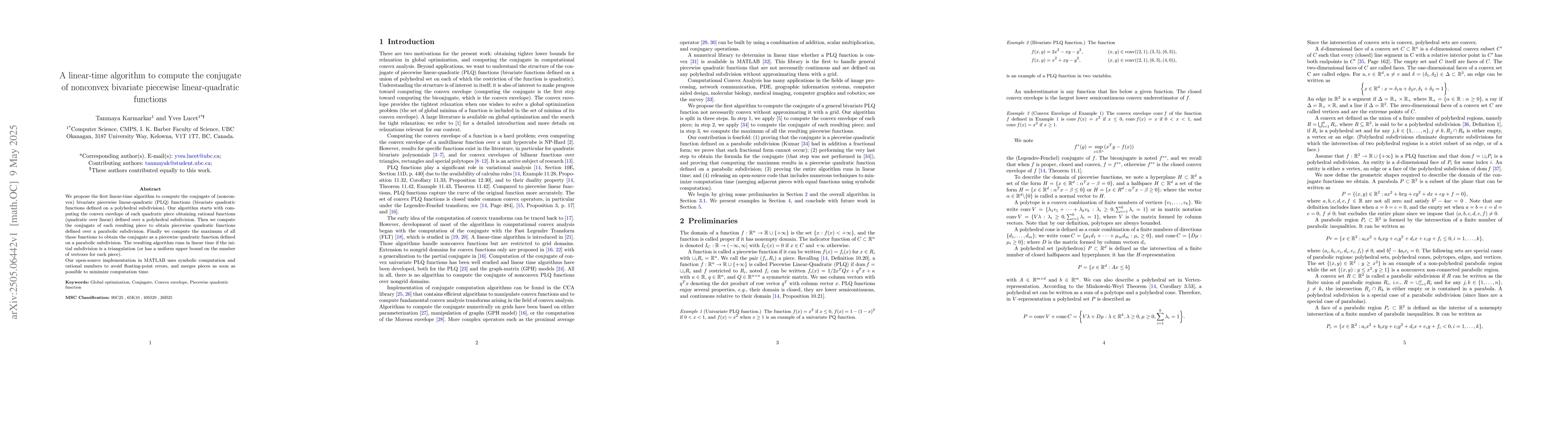 The research proposes a linear-time algorithm for computing the conjugate of nonconvex bivariate piecewise linear-quadratic functions, starting with convex envelope computation of each quadratic piece, followed by conjugate computation of each resulting piece, and finally determining the maximum of these functions.