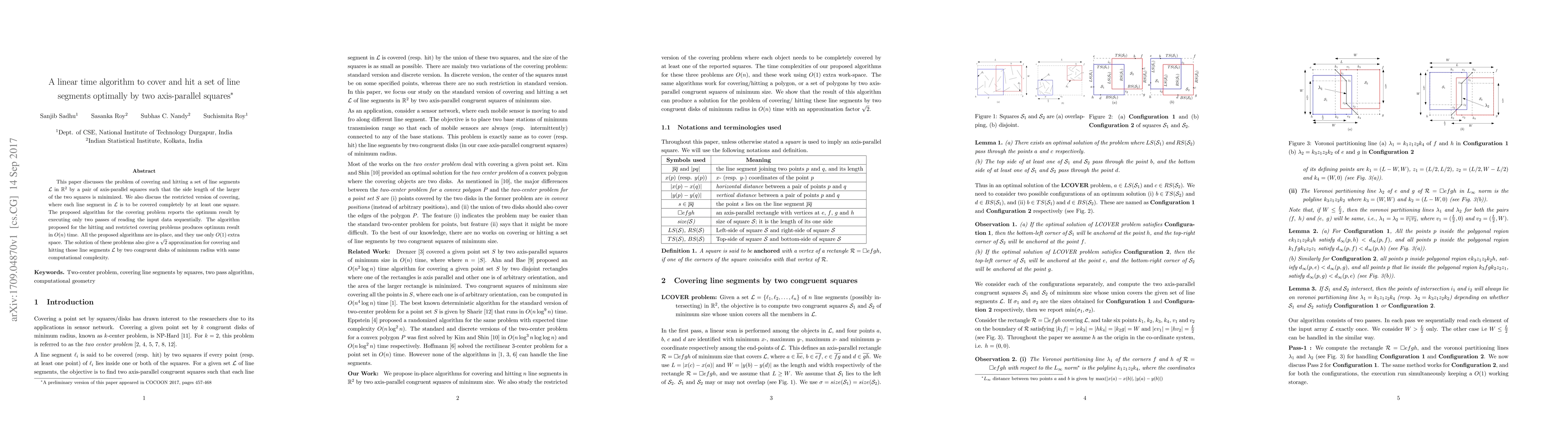 This paper discusses the problem of covering and hitting a set of line segments $\cal L$ in ${\mathbb R}^2$ by a pair of axis-parallel squares such that the side length of the larger of the two squares is minimized. We also discuss the restricted version of covering, where each line segment in $\cal L$ is to be covered completely by at least one square. The proposed algorithm for the covering problem reports the optimum result by executing only two passes of reading the input data sequentially. The algorithm proposed for the hitting and restricted covering problems produces optimum result in $O(n)$ time. All the proposed algorithms are in-place, and they use only $O(1)$ extra space. The solution of these problems also give a $\sqrt{2}$ approximation for covering and hitting those line segments $\cal L$ by two congruent disks of minimum radius with same computational complexity.