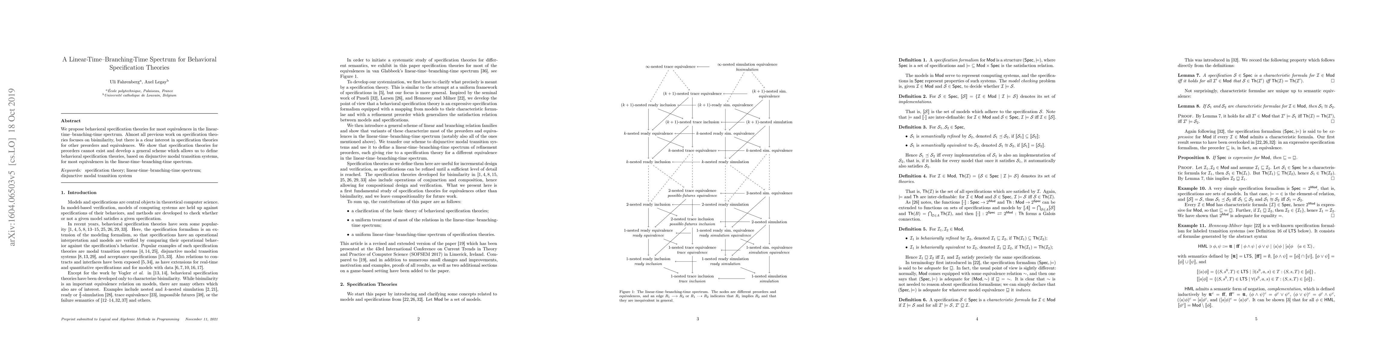 The paper proposes behavioral specification theories for most equivalences in the linear-time--branching-time spectrum, moving beyond bisimilarity. It demonstrates that specification theories for preorders do not exist and introduces a scheme using disjunctive modal transition systems to define these theories for various equivalences.
