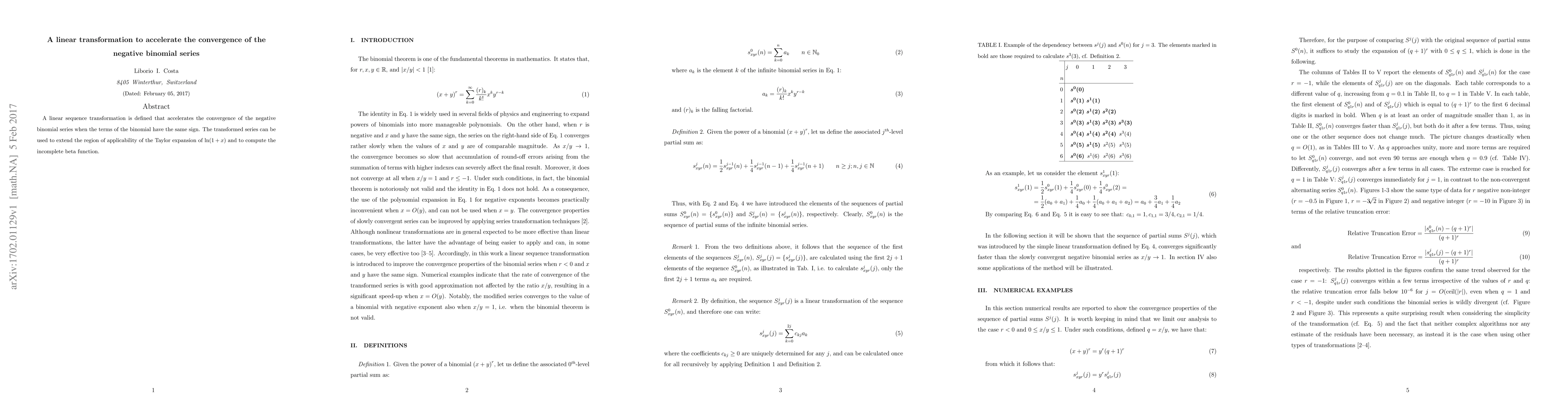 A linear sequence transformation is defined that accelerates the convergence of the negative binomial series when the terms of the binomial have the same sign. The transformed series can be used to extend the region of applicability of the Taylor expansion of ln(1+x) and to compute the incomplete beta function.