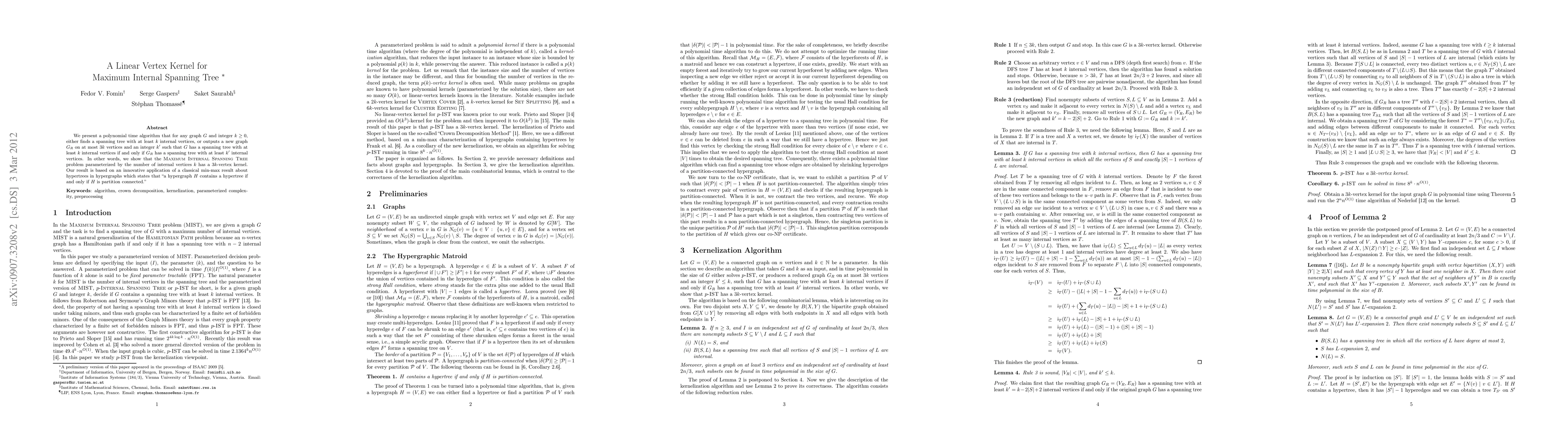 We present a polynomial time algorithm that for any graph G and integer k >= 0, either finds a spanning tree with at least k internal vertices, or outputs a new graph G' on at most 3k vertices and an integer k' such that G has a spanning tree with at least k internal vertices if and only if G' has a spanning tree with at least k' internal vertices. In other words, we show that the Maximum Internal Spanning Tree problem parameterized by the number of internal vertices k, has a 3k-vertex kernel. Our result is based on an innovative application of a classical min-max result about hypertrees in hypergraphs which states that "a hypergraph H contains a hypertree if and only if H is partition connected."
