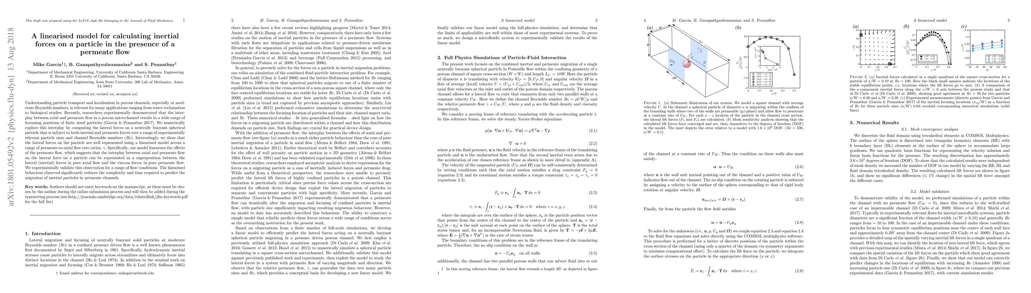 Understanding particle transport and localisation in porous channels, especially at moderate Reynolds numbers, is relevant for many applications ranging from water reclamation to biological studies. Recently, researchers experimentally demonstrated that the interplay between axial and permeate flow in a porous microchannel results in a wide range of focussing positions of finite sized particles (Garcia & Pennathur 2017) . We numerically explore this interplay by computing the lateral forces on a neutrally buoyant spherical particle that is subject to both inertial and permeate forces over a range of experimentally relevant particle sizes and channel Reynolds numbers (Re). Interestingly, we show that the lateral forces on the particle is well represented using a linearised model across a range of permeate-to-axial flow rate ratios, $\gamma$. Specifically, our model linearises the effects of the permeate flow, which suggests that the interplay between axial and permeate flow on the lateral force on a particle can be represented as a superposition between the lateral (inertial) forces in pure axial flow and the viscous forces in pure permeate flow. We experimentally validate this observation for a range of flow conditions. The linearised behaviour observed significantly reduces the complexity and time required to predict the migration of inertial particles in permeate channels.