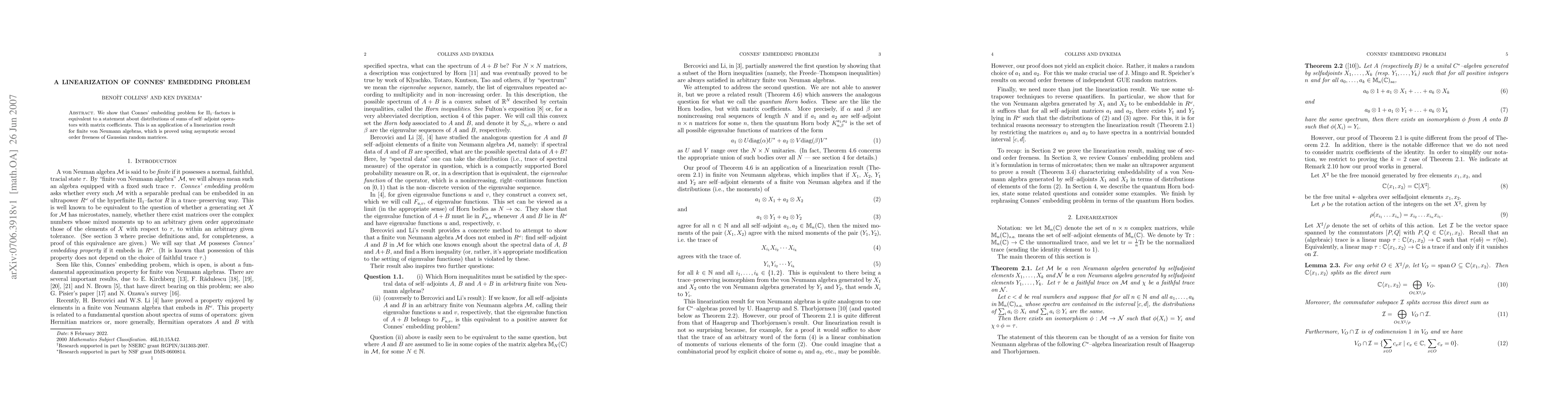 Summary: The paper demonstrates that Connes' embedding problem for II_1-factors is equivalent to a statement regarding the distributions of sums of self-adjoint operators, leveraging a linearization result for finite von Neumann algebras based on the asymptotic second order freeness of Gaussian random matrices.