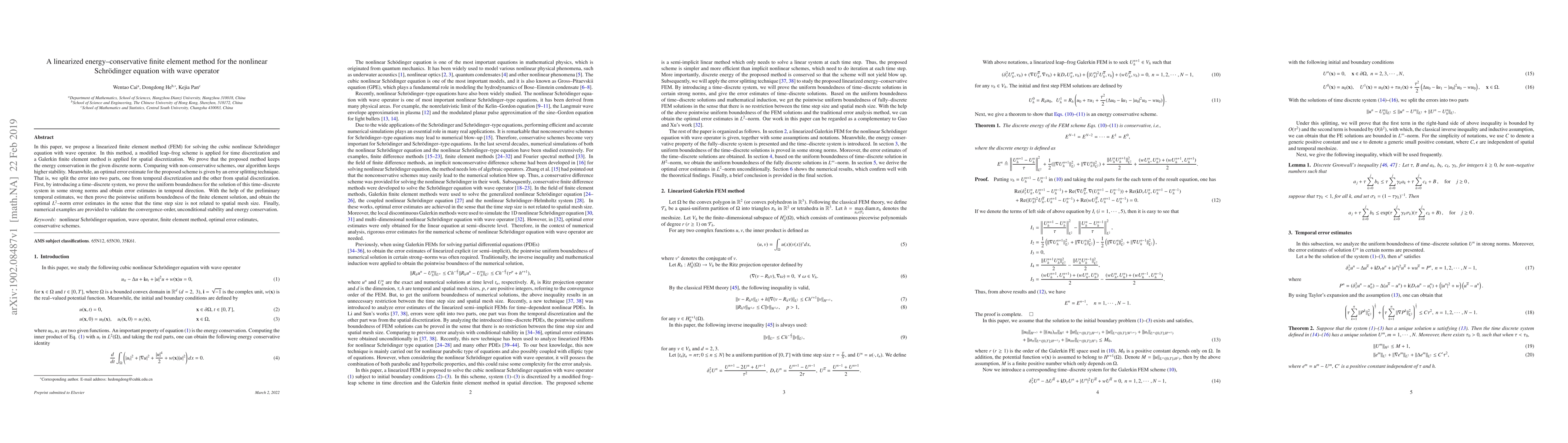 This paper proposes a linearized finite element method for solving the nonlinear Schrödinger equation with a wave operator, utilizing a modified leap-frog scheme for time discretization and a Galerkin FEM for spatial discretization. The method is shown to conserve energy and maintain higher stability compared to non-conservative schemes, with an optimal error estimate derived through error splitting techniques.