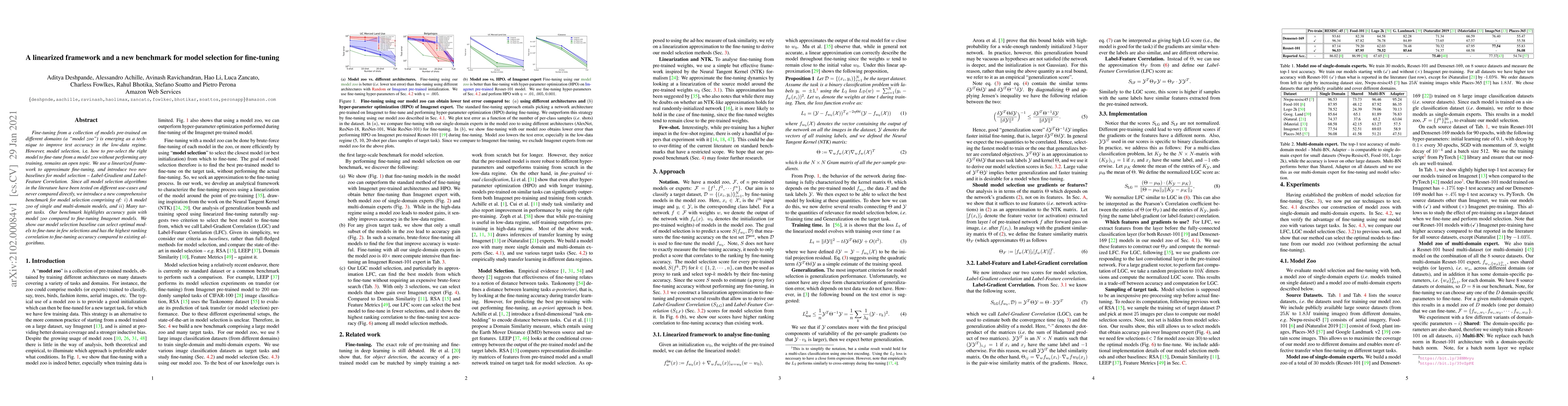 Fine-tuning from a collection of models pre-trained on different domains (a "model zoo") is emerging as a technique to improve test accuracy in the low-data regime. However, model selection, i.e. how to pre-select the right model to fine-tune from a model zoo without performing any training, remains an open topic. We use a linearized framework to approximate fine-tuning, and introduce two new baselines for model selection -- Label-Gradient and Label-Feature Correlation. Since all model selection algorithms in the literature have been tested on different use-cases and never compared directly, we introduce a new comprehensive benchmark for model selection comprising of: i) A model zoo of single and multi-domain models, and ii) Many target tasks. Our benchmark highlights accuracy gain with model zoo compared to fine-tuning Imagenet models. We show our model selection baseline can select optimal models to fine-tune in few selections and has the highest ranking correlation to fine-tuning accuracy compared to existing algorithms.