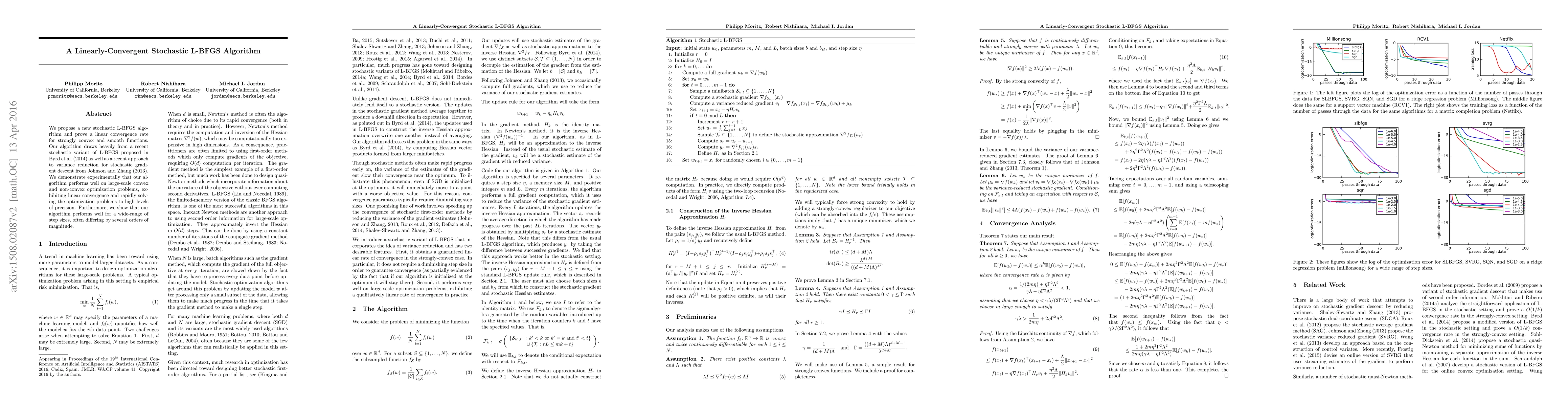 This paper introduces a new stochastic L-BFGS algorithm that demonstrates linear convergence for strongly convex and smooth functions. The algorithm combines elements from a recent stochastic variant and variance reduction techniques, showing strong performance on large-scale optimization problems across various step sizes.