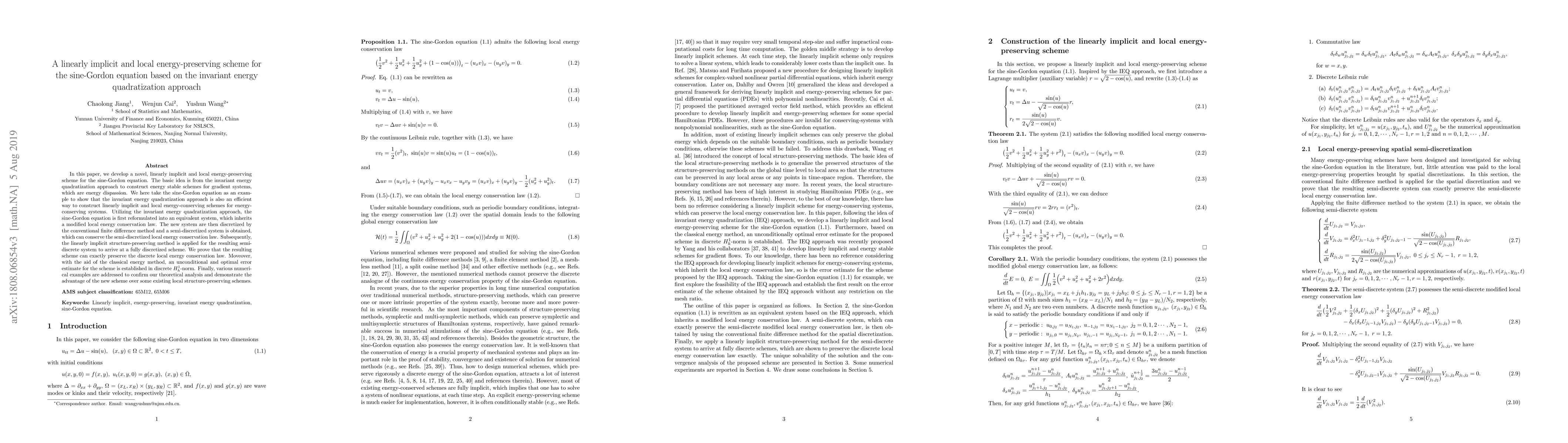 In this paper, we develop a novel, linearly implicit and local energy-preserving scheme for the sine-Gordon equation. The basic idea is from the invariant energy quadratization approach to construct energy stable schemes for gradient systems, which are energy dispassion. We here take the sine-Gordon equation as an example to show that the invariant energy quadratization approach is also an efficient way to construct linearly implicit and local energy-conserving schemes for energy-conserving systems. Utilizing the invariant energy quadratization approach, the sine-Gordon equation is first reformulated into an equivalent system, which inherits a modified local energy conservation law. The new system are then discretized by the conventional finite difference method and a semi-discretized system is obtained, which can conserve the semi-discretized local energy conservation law. Subsequently, the linearly implicit structure-preserving method is applied for the resulting semi-discrete system to arrive at a fully discretized scheme. We prove that the resulting scheme can exactly preserve the discrete local energy conservation law. Moveover, with the aid of the classical energy method, an unconditional and optimal error estimate for the scheme is established in discrete $H_h^1$-norm. Finally, various numerical examples are addressed to confirm our theoretical analysis and demonstrate the advantage of the new scheme over some existing local structure-preserving schemes.
