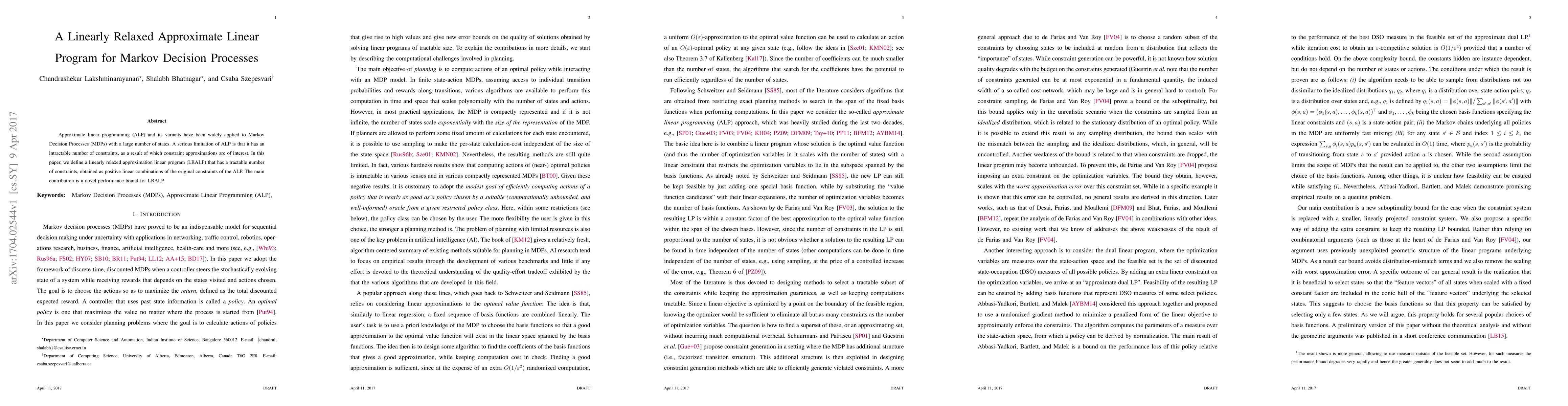 This paper introduces a linearly relaxed approximate linear program (LRALP) for Markov Decision Processes (MDPs) to address the constraint intractability of traditional approximate linear programming (ALP). The LRALP features a tractable number of constraints and provides a novel performance bound.