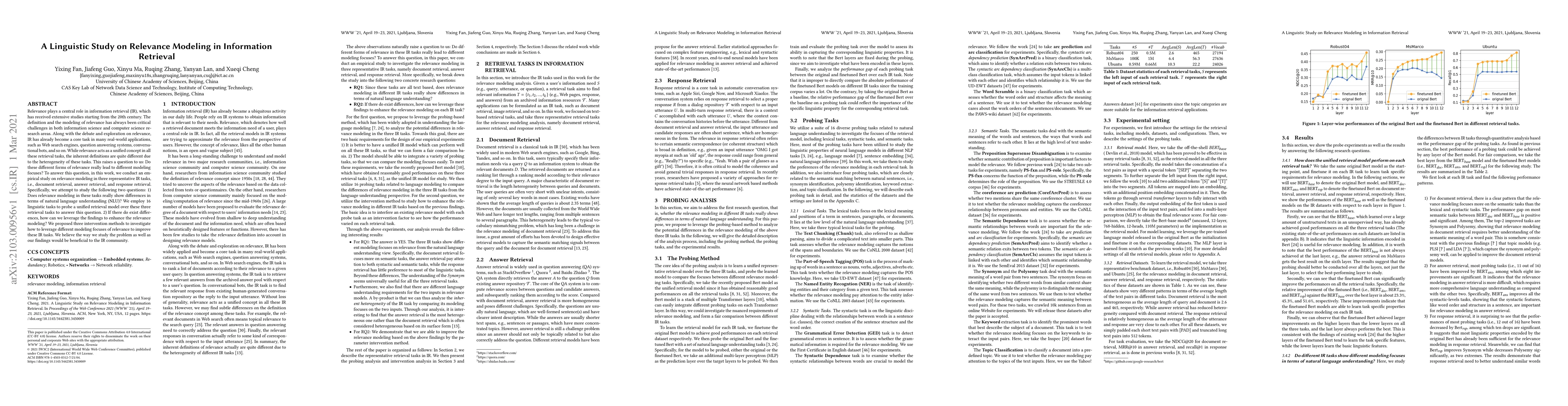 This paper investigates the differences in relevance modeling across three information retrieval tasks: document retrieval, answer retrieval, and response retrieval. It employs 16 linguistic tasks to explore whether these tasks exhibit different natural language understanding requirements and proposes three methods to enhance relevance modeling based on identified differences.