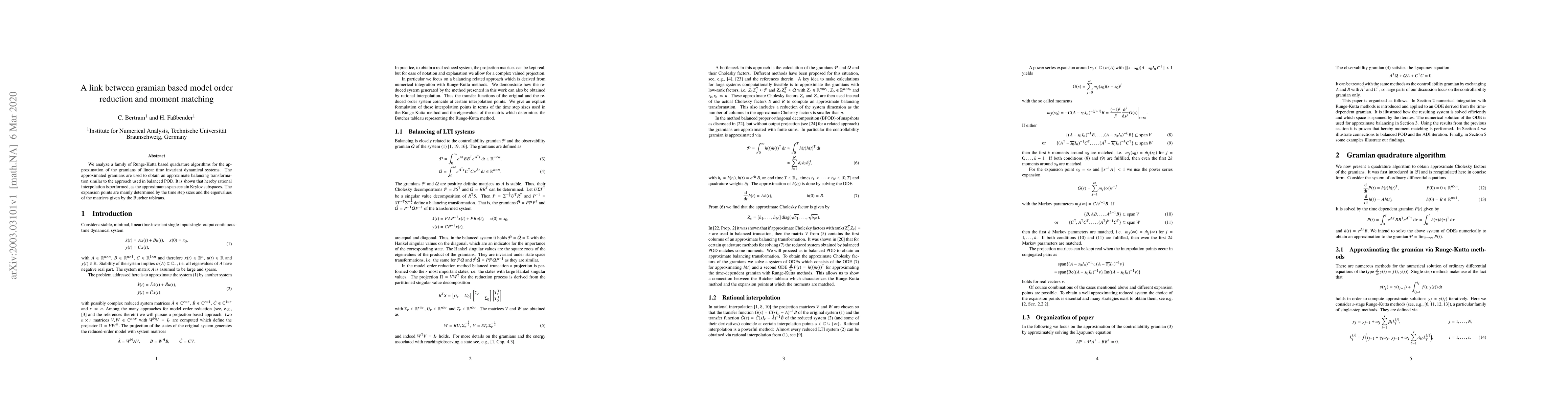 We analyze a family of Runge-Kutta based quadrature algorithms for the approximation of the gramians of linear time invariant dynamical systems. The approximated gramians are used to obtain an approximate balancing transformation similar to the approach used in balanced POD. It is shown that hereby rational interpolation is performed, as the approximants span certain Krylov subspaces. The expansion points are mainly determined by the time step sizes and the eigenvalues of the matrices given by the Butcher tableaus.