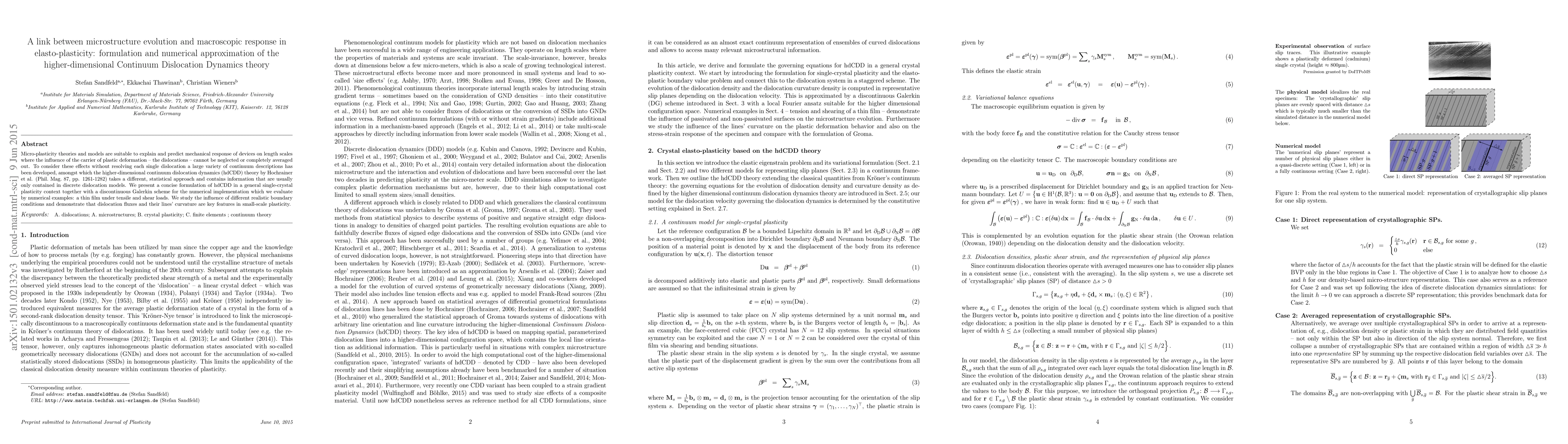 Micro-plasticity theories and models are suitable to explain and predict mechanical response of devices on length scales where the influence of the carrier of plastic deformation - the dislocations - cannot be neglected or completely averaged out. To consider these effects without resolving each single dislocation a large variety of continuum descriptions has been developed, amongst which the higher-dimensional continuum dislocation dynamics (hdCDD) theory by Hochrainer et al. (Phil. Mag. 87, pp. 1261-1282) takes a different, statistical approach and contains information that are usually only contained in discrete dislocation models. We present a concise formulation of hdCDD in a general single-crystal plasticity context together with a discontinuous Galerkin scheme for the numerical implementation which we evaluate by numerical examples: a thin film under tensile and shear loads. We study the influence of different realistic boundary conditions and demonstrate that dislocation fluxes and their lines' curvature are key features in small-scale plasticity.