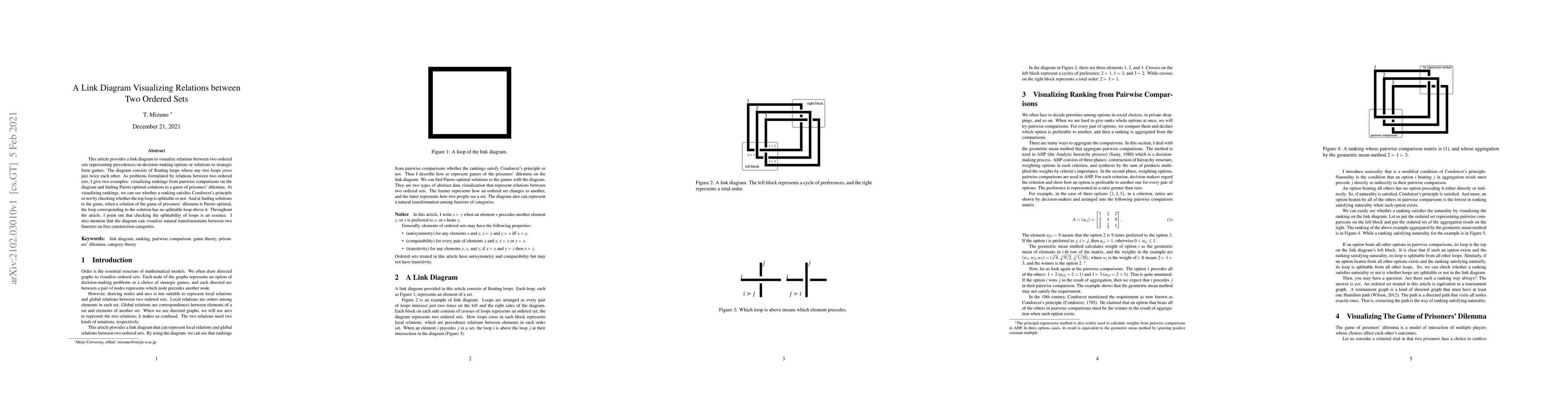 This article provides a link diagram to visualize relations between two ordered sets representing precedences on decision-making options or solutions to strategic form games. The diagram consists of floating loops whose any two loops cross just twice each other. As problems formulated by relations between two ordered sets, I give two examples: visualizing rankings from pairwise comparisons on the diagram and finding Pareto optimal solutions to a game of prisoners' dilemma. At visualizing rankings, we can see whether a ranking satisfies Condorcet's principle or not by checking whether the top loop is splittable or not. And at finding solutions to the game, when a solution of the game of prisoners' dilemma is Pareto optimal, the loop corresponding to the solution has no splittable loop above it. Throughout the article, I point out that checking the splittability of loops is an essence. I also mention that the diagram can visualize natural transformations between two functors on free construction categories.
