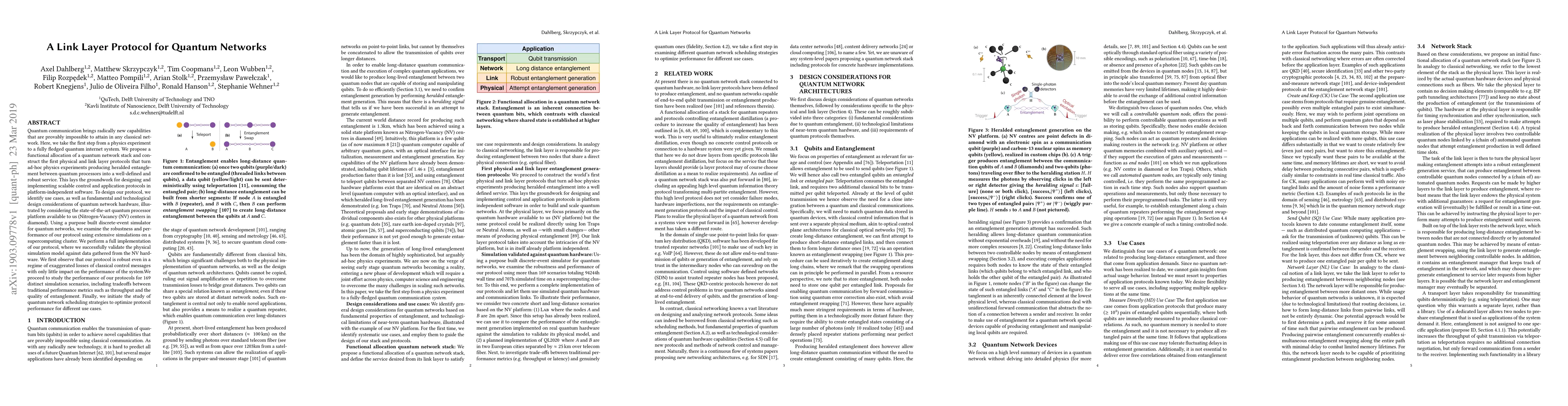 This paper proposes the first physical and link layer protocols for quantum networks, transforming ad-hoc quantum entanglement experiments into a robust service. The authors validate their protocol through extensive simulations and hardware experiments using NV centers in diamond, demonstrating its robustness and performance across various scenarios.