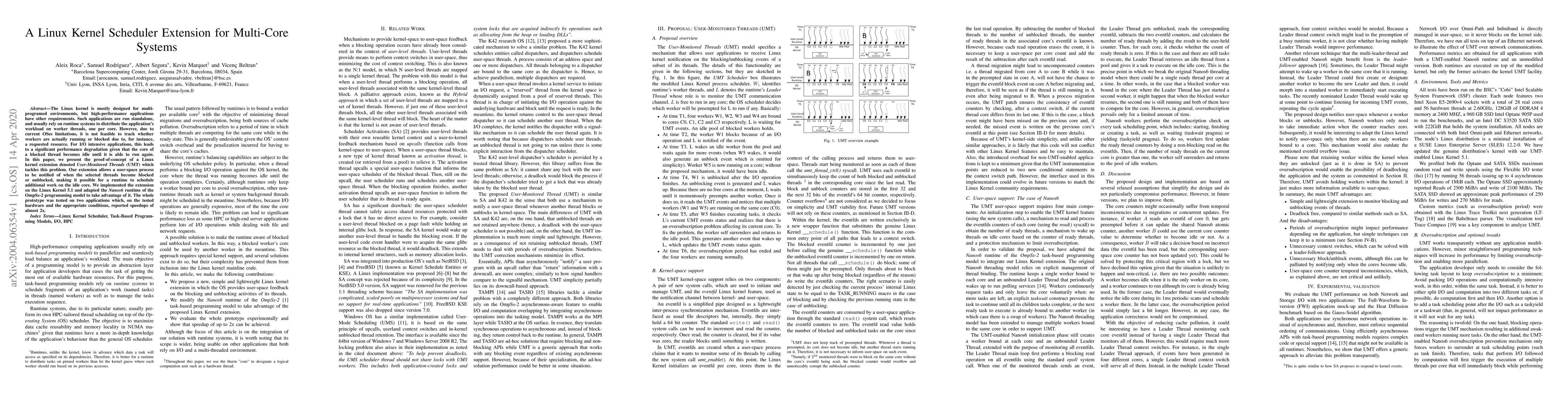 The Linux kernel is mostly designed for multi-programed environments, but high-performance applications have other requirements. Such applications are run standalone, and usually rely on runtime systems to distribute the application's workload on worker threads, one per core. However, due to current OSes limitations, it is not feasible to track whether workers are actually running or blocked due to, for instance, a requested resource. For I/O intensive applications, this leads to a significant performance degradation given that the core of a blocked thread becomes idle until it is able to run again. In this paper, we present the proof-of-concept of a Linux kernel extension denoted User-Monitored Threads (UMT) which tackles this problem. Our extension allows a user-space process to be notified of when the selected threads become blocked or unblocked, making it possible for a runtime to schedule additional work on the idle core. We implemented the extension on the Linux Kernel 5.1 and adapted the Nanos6 runtime of the OmpSs-2 programming model to take advantage of it. The whole prototype was tested on two applications which, on the tested hardware and the appropriate conditions, reported speedups of almost 2x.