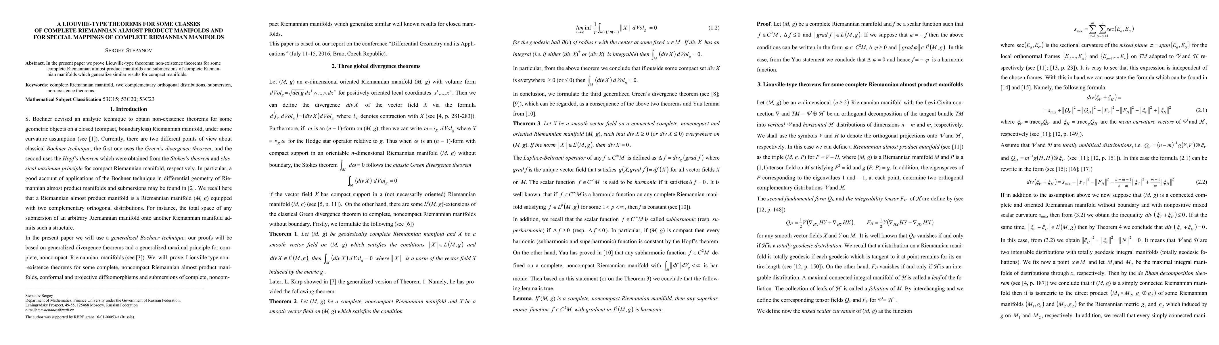 Summary: This paper establishes Liouville-type theorems proving the non-existence of certain complete Riemannian almost product manifolds and special mappings, extending similar results previously found for compact manifolds.