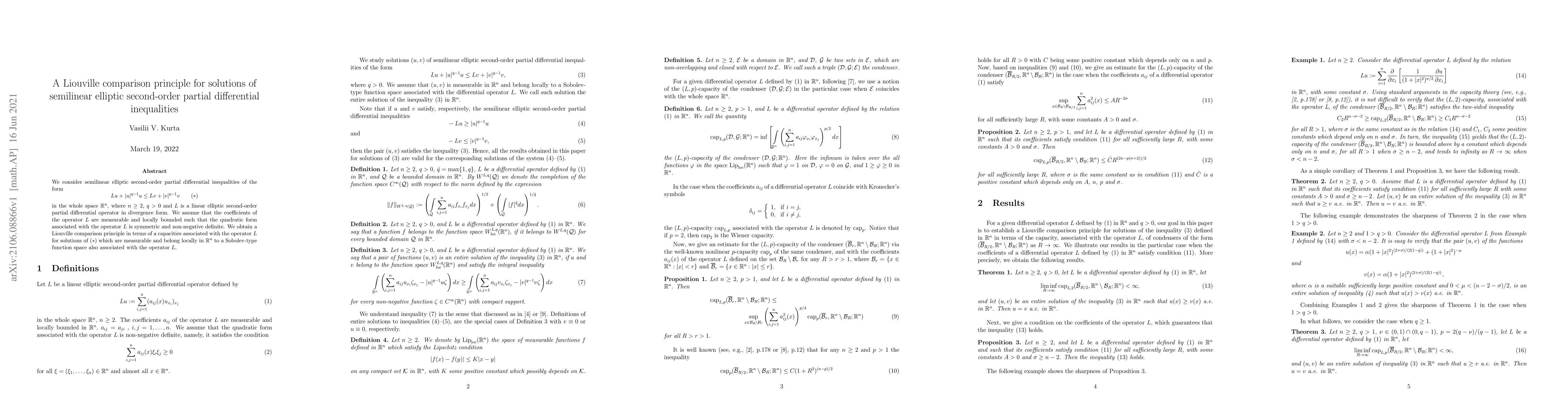 We consider semilinear elliptic second-order partial differential inequalities of the form Lu +|u|q-1u < and = Lv +|v|q-1v (*) in the whole space Rn, where n > and = 2, q > 0 and L is a linear elliptic second-order partial differential operator in divergence form. We assume that the coefficients of the operator L are defined, measurable and locally bounded in Rn, and that the quadratic form associated with the operator L is symmetric and non-negative definite. We obtain a Liouville comparison principle in terms of a capacity associated with the operator L for solutions of (*), which are defined and measurable in Rn and which belong locally to a Sobolev-type function space also associated with the operator L.
