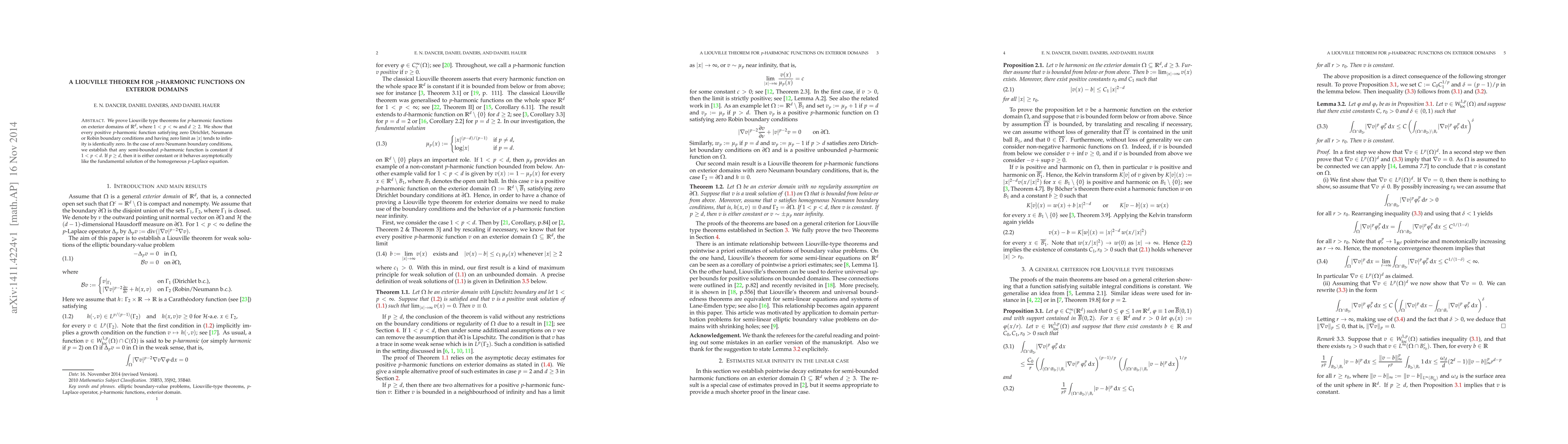 This paper proves Liouville theorems for $p$-harmonic functions on exterior domains, showing that positive $p$-harmonic functions with specific boundary conditions and decay at infinity are zero, and explores behavior for semi-bounded functions under Neumann boundary conditions.