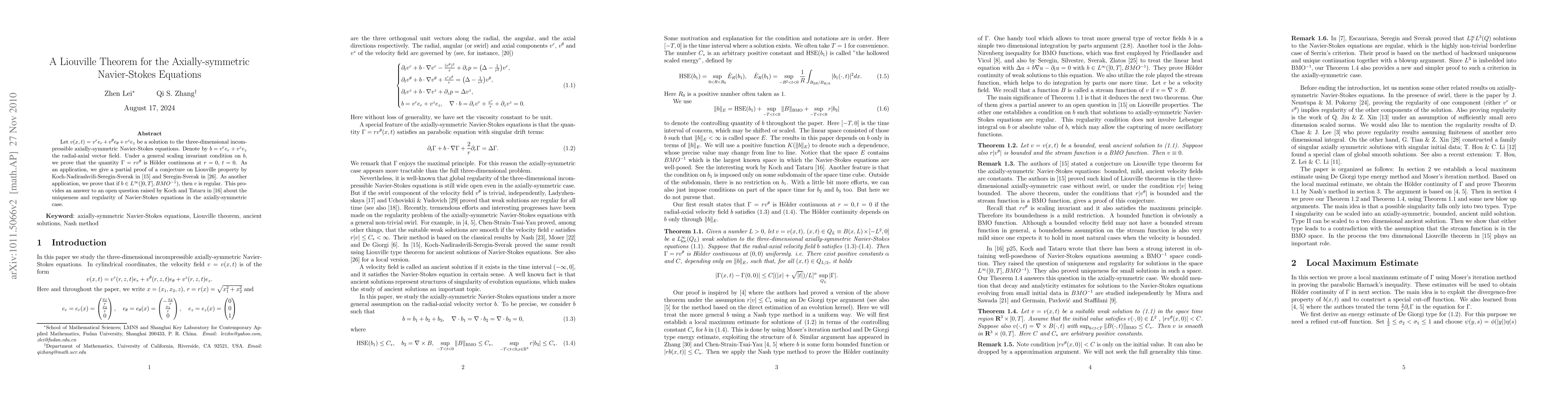 This paper proves a Liouville theorem for axially-symmetric solutions to the Navier-Stokes equations under a scaling invariant condition, showing that the angular component is H\"older continuous at the origin. It also provides a partial proof of a conjecture on the Liouville property and establishes the regularity of solutions under certain conditions.