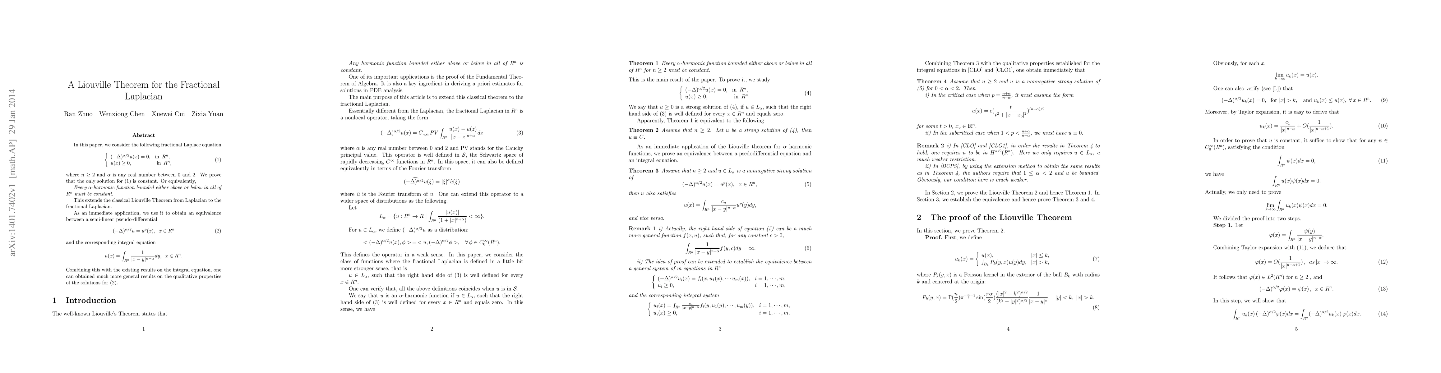 Summary: This paper extends the classical Liouville Theorem to the fractional Laplacian, proving that any $\alpha$-harmonic function bounded in $\mathbb{R}^n$ must be constant. This generalizes the theorem from integer to fractional order differential operators.