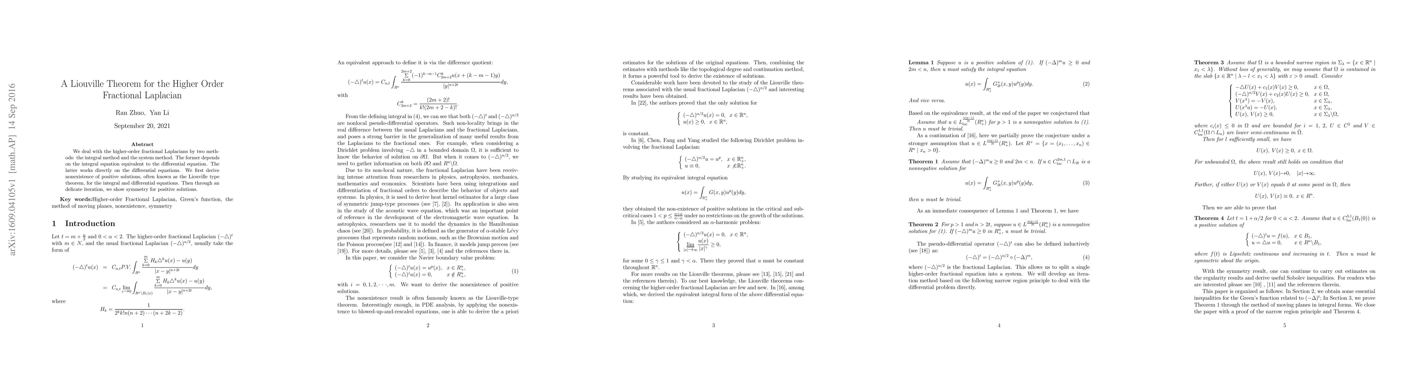 We deal with the higher-order fractional Laplacians by two methods: the integral method and the system method. The former depends on the integral equation equivalent to the differential equation. The latter works directly on the differential equations. We first derive nonexistence of positive solutions, often known as the Liouville type theorem, for the integral and differential equations. Then through an delicate iteration, we show symmetry for positive solutions.