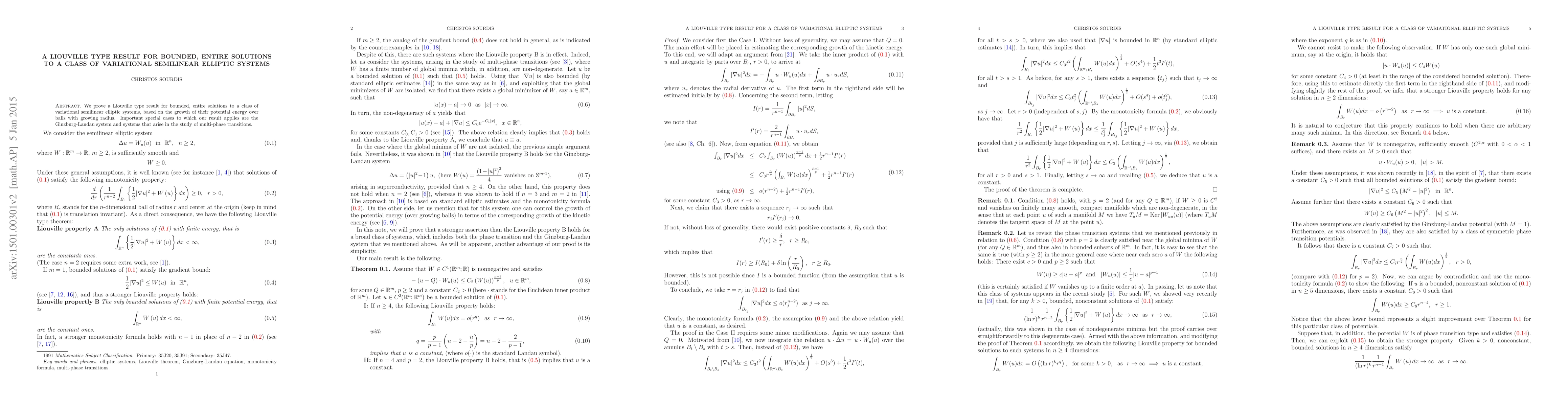 Researchers prove a Liouville type result for bounded, entire solutions to certain variational semilinear elliptic systems, showing that their potential energy grows unbounded over large distances.