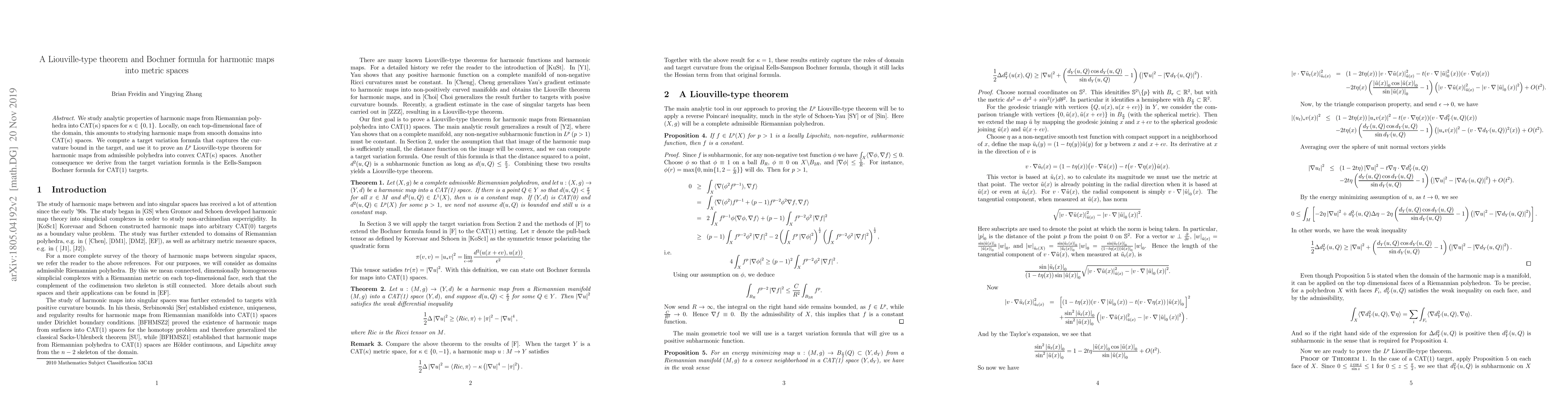 We study analytic properties of harmonic maps from Riemannian polyhedra into CAT($\kappa$) spaces for $\kappa\in\{0,1\}$. Locally, on each top-dimensional face of the domain, this amounts to studying harmonic maps from smooth domains into CAT($\kappa$) spaces. We compute a target variation formula that captures the curvature bound in the target, and use it to prove an $L^p$ Liouville-type theorem for harmonic maps from admissible polyhedra into convex CAT($\kappa$) spaces. Another consequence we derive from the target variation formula is the Eells-Sampson Bochner formula for CAT(1) targets.