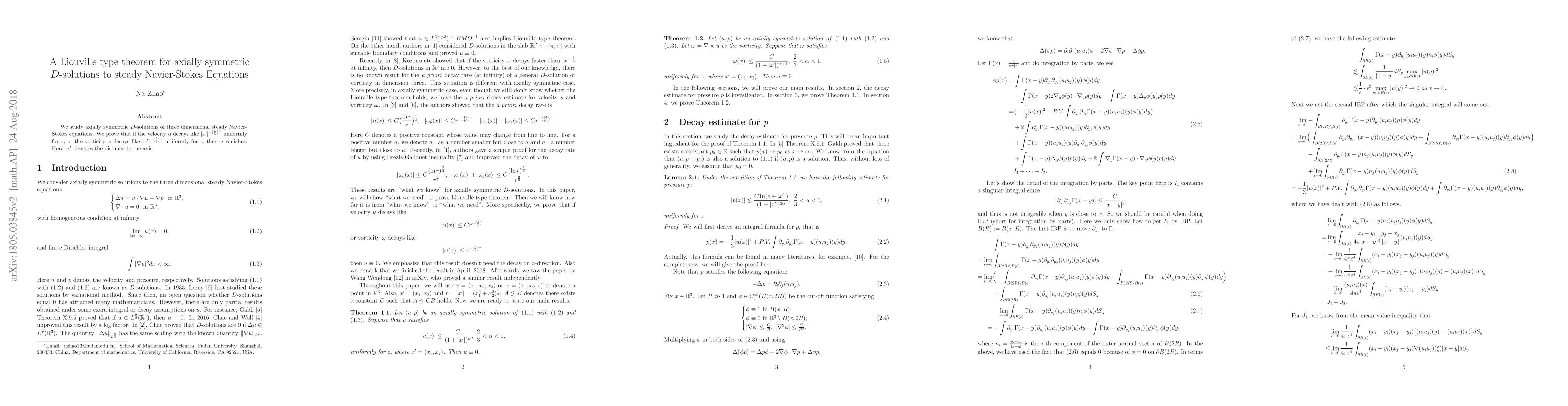 Researchers prove that in 3D Navier-Stokes equations, axially symmetric $D$-solutions with specific decay rates for velocity or vorticity vanish, shedding light on steady-state fluid dynamics.