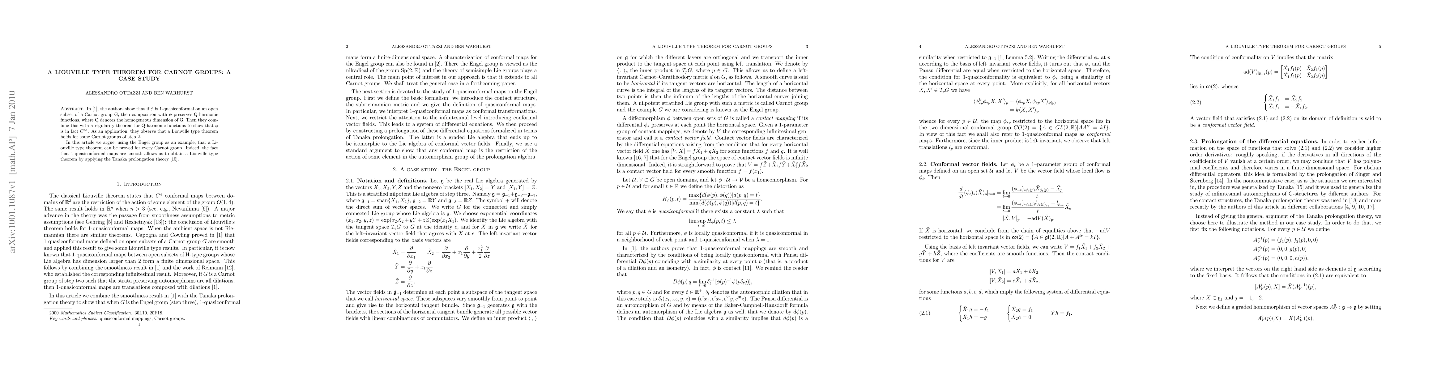 L. Capogna and M. Cowling showed that if $\phi$ is 1-quasiconformal on an open subset of a Carnot group G, then composition with $\phi$ preserves Q-harmonic functions, where Q denotes the homogeneous dimension of G. Then they combine this with a regularity theorem for Q-harmonic functions to show that $\phi$ is in fact $C^\infty$. As an application, they observe that a Liouville type theorem holds for some Carnot groups of step 2. In this article we argue, using the Engel group as an example, that a Liouville type theorem can be proved for every Carnot group. Indeed, the fact that 1-quasiconformal maps are smooth allows us to obtain a Liouville type theorem by applying the Tanaka prolongation theory.