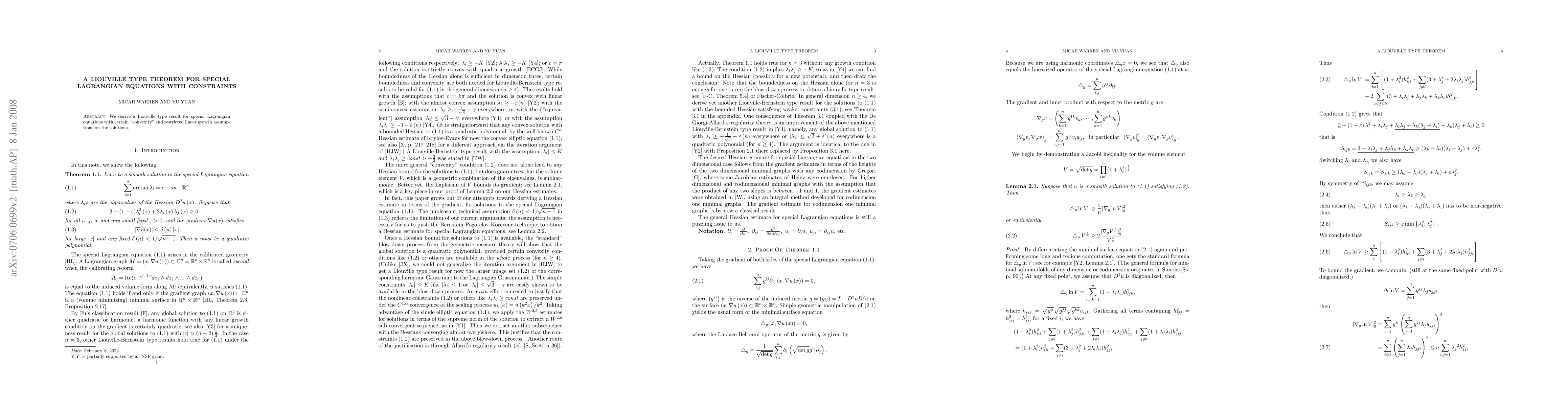 Researchers derived a Liouville type theorem for special Lagrangian equations with convexity and restricted linear growth assumptions, providing new insights into the behavior of solutions under these conditions.
