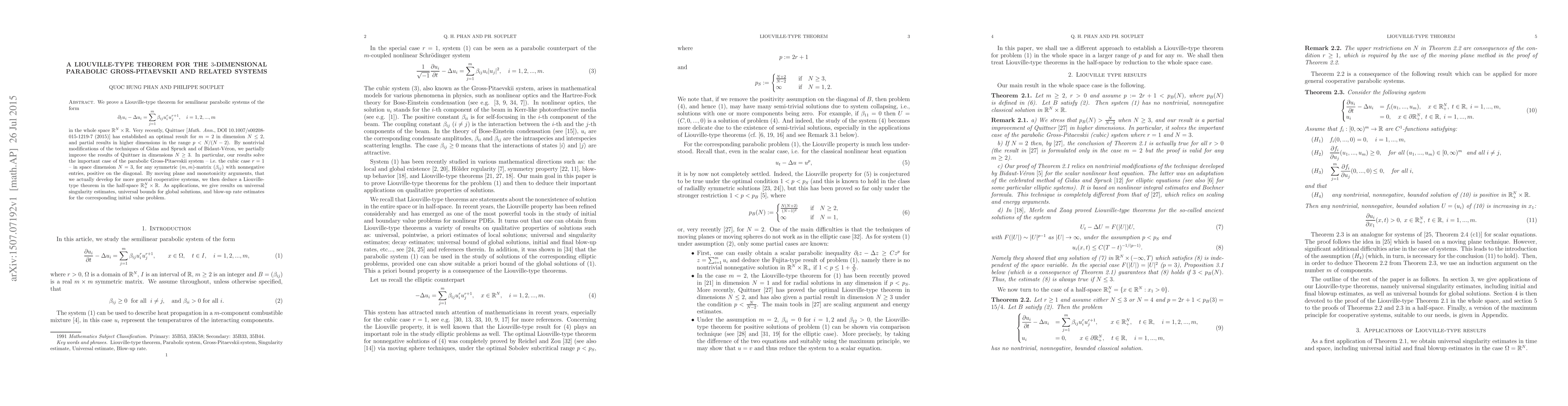 We prove a Liouville-type theorem for semilinear parabolic systems of the form $${\partial_t u_i}-\Delta u_i =\sum_{j=1}^{m}\beta_{ij} u_i^ru_j^{r+1}, \quad i=1,2,...,m$$ in the whole space ${\mathbb R}^N\times {\mathbb R}$. Very recently, Quittner [{\em Math. Ann.}, DOI 10.1007/s00208-015-1219-7 (2015)] has established an optimal result for $m=2$ in dimension $N\leq 2$, and partial results in higher dimensions in the range $p< N/(N-2)$. By nontrivial modifications of the techniques of Gidas and Spruck and of Bidaut-V\'eron, we partially improve the results of Quittner in dimensions $N\geq 3$. In particular, our results solve the important case of the parabolic Gross-Pitaevskii system -- i.e. the cubic case $r=1$ -- in space dimension $N=3$, for any symmetric $(m,m)$-matrix $(\beta_{ij})$ with nonnegative entries, positive on the diagonal. By moving plane and monotonicity arguments, that we actually develop for more general cooperative systems, we then deduce a Liouville-type theorem in the half-space ${\mathbb R}^N_+\times {\mathbb R}$. As applications, we give results on universal singularity estimates, universal bounds for global solutions, and blow-up rate estimates for the corresponding initial value problem.