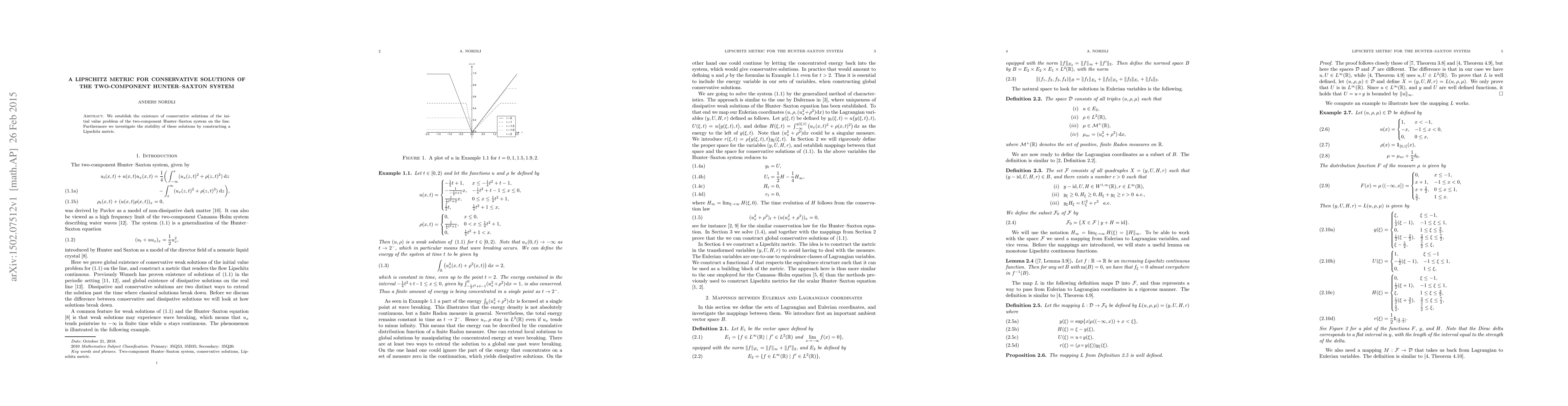 This paper establishes the existence of conservative solutions for the two-component Hunter-Saxton system and investigates their stability through the construction of a Lipschitz metric.