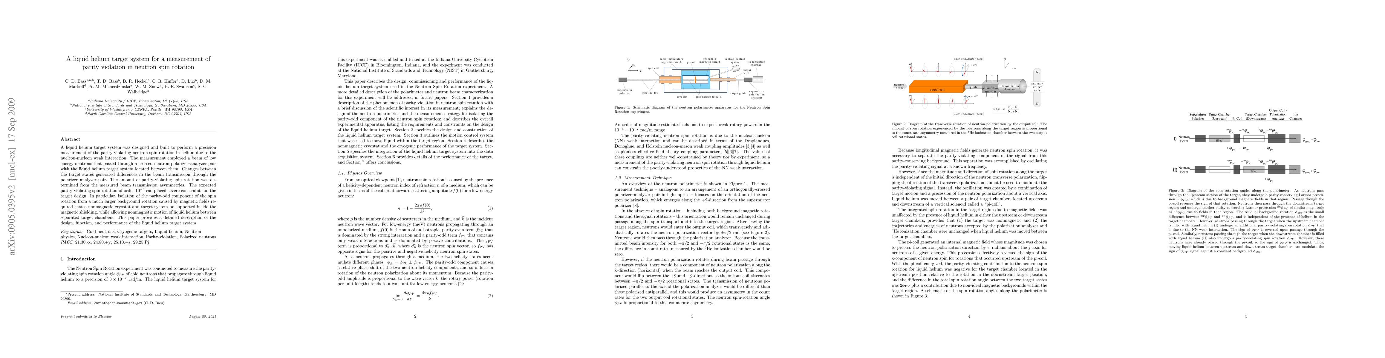 A liquid helium target system was designed and built to perform a precision measurement of the parity-violating neutron spin rotation in helium due to the nucleon-nucleon weak interaction. The measurement employed a beam of low energy neutrons that passed through a crossed neutron polarizer--analyzer pair with the liquid helium target system located between them. Changes between the target states generated differences in the beam transmission through the polarizer--analyzer pair. The amount of parity-violating spin rotation was determined from the measured beam transmission asymmetries. The expected parity-violating spin rotation of order $10^{-6}$ rad placed severe constraints on the target design. In particular, isolation of the parity-odd component of the spin rotation from a much larger background rotation caused by magnetic fields required that a nonmagnetic cryostat and target system be supported inside the magnetic shielding, while allowing nonmagnetic motion of liquid helium between separated target chambers. This paper provides a detailed description of the design, function, and performance of the liquid helium target system.